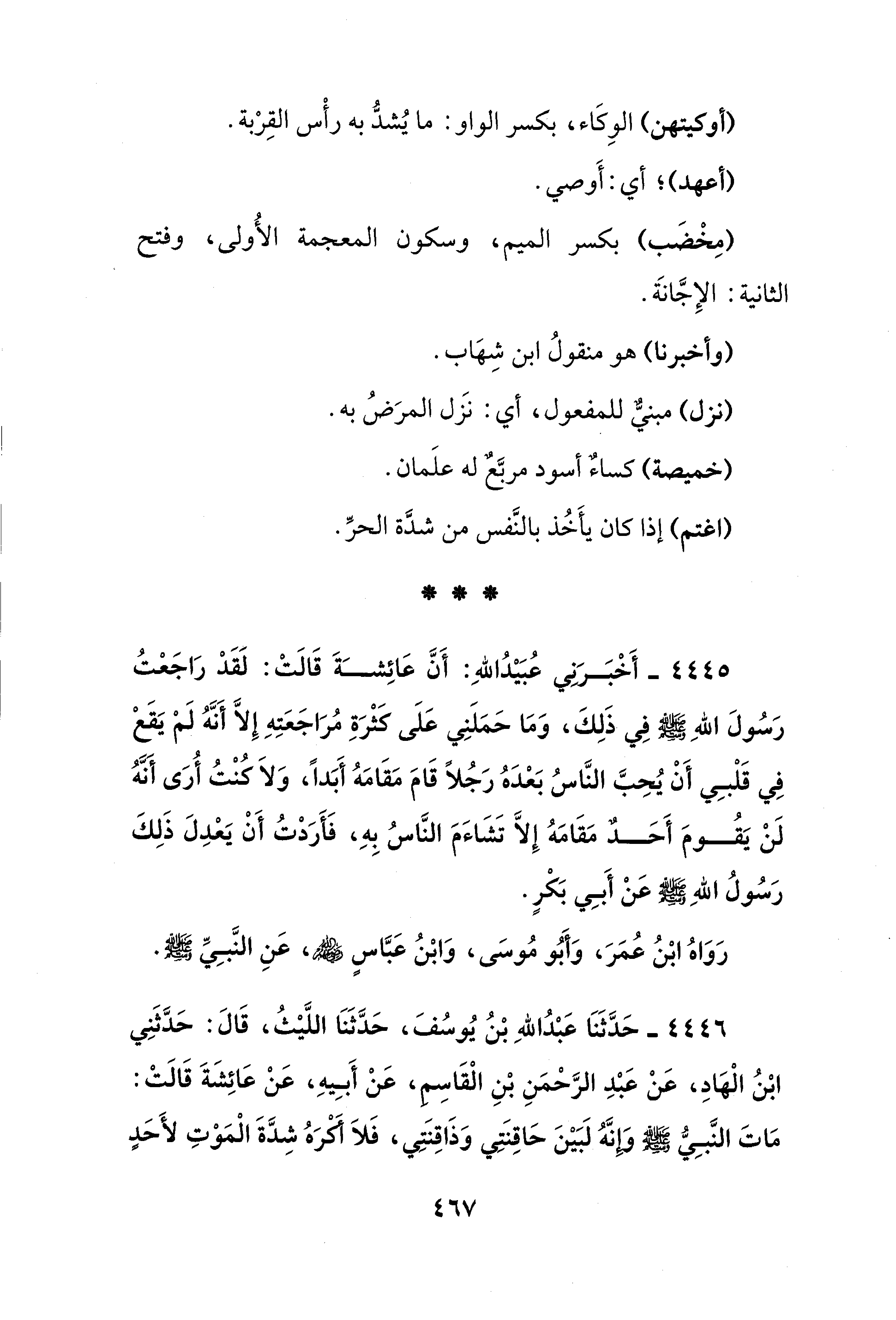 4446 - حَدَّثَنَا عَبْدُ اللهِ بْنُ يُوسُفَ، حَدَّثَنَا اللَّيْثُ، قَالَ: حَدَّثَنِي ابْنُ الْهَادِ، عَنْ عَبْدِ الرَّحْمَنِ بْنِ الْقَاسِمِ، عَنْ أَبِيهِ، عَنْ عَائِشَةَ قَالَتْ: مَاتَ النَّبِيُّ - صلى الله عليه وسلم - وَإِنَّهُ لَبَيْنَ حَاقِنَتِي وَذَاقِنَتِي، فَلَا أَكرَهُ شِدَّةَ الْمَوْتِ لأَحَدٍ