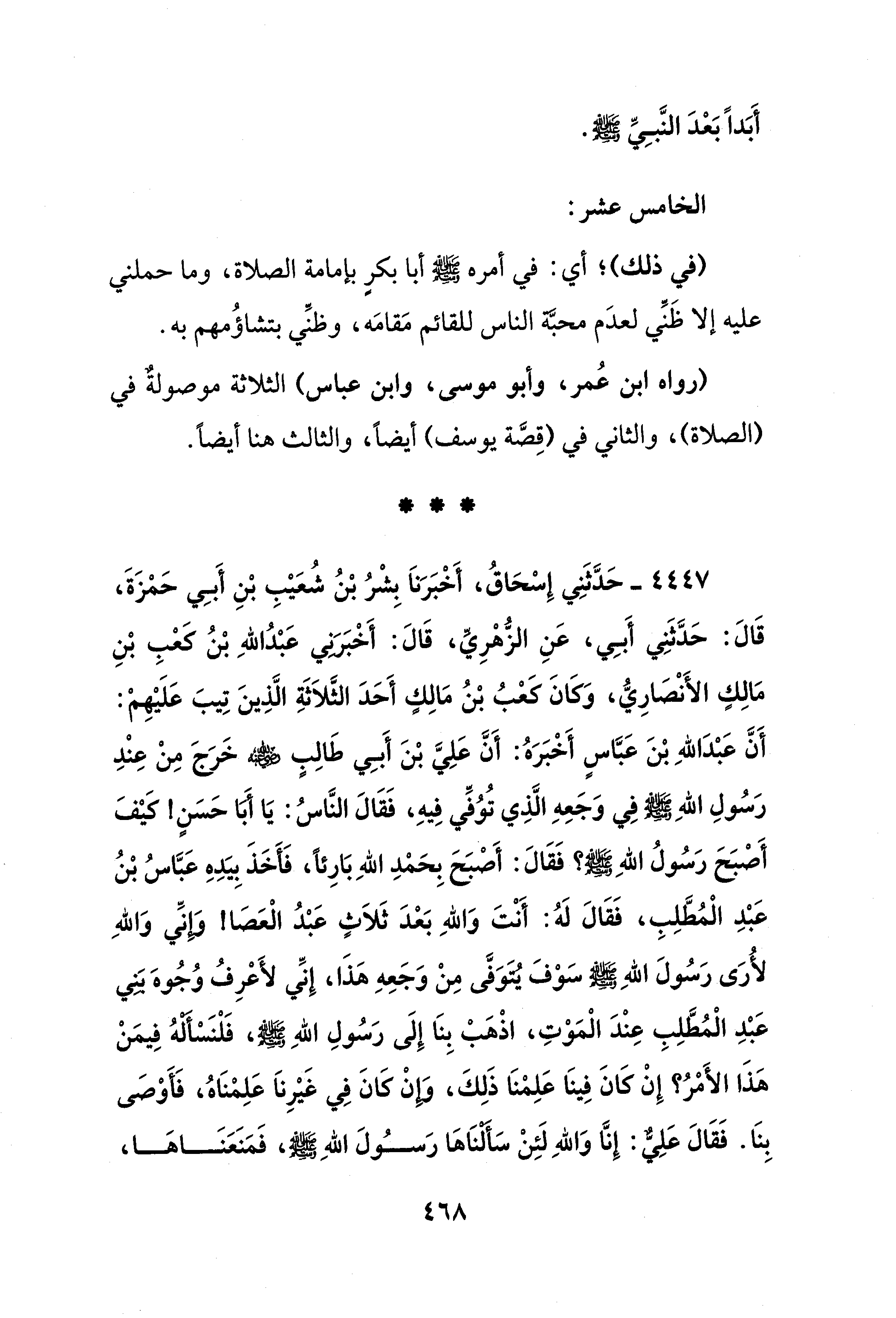 4447 - حَدَّثَنِي إِسْحَاقُ، أَخْبَرَنَا بِشْرُ بْنُ شُعَيْبِ بْنِ أَبِي حَمْزَةَ، قَالَ: حَدَّثَنِي أَبِي، عَنِ الزُّهْرِيِّ، قَالَ: أَخْبَرني عَبْدُ اللهِ بْنُ كعْبِ بْنِ مَالِكٍ الأَنْصَارِيُّ، وَكَانَ كعْبُ بْنُ مَالِكٍ أَحَدَ الثَّلَاثَةِ الَّذِينَ تِيبَ عَلَيْهِمْ: أَنَّ عَبْدَ اللهِ بْنَ عَبَّاسٍ أَخْبَرَهُ: أَنَّ عَلِيَّ بْنَ أَبِي طَالِبٍ - رضي الله عنه - خَرَجَ مِنْ عِنْدِ رَسُولِ اللهِ - صلى الله عليه وسلم - في وَجَعِهِ الَّذِي تُوُفِّي فِيهِ، فَقَالَ النَّاسُ: يَا أَبَا حَسَنٍ! كَيْفَ أَصْبَحَ رَسُولُ اللهِ - صلى الله عليه وسلم -؟ فَقَالَ: أَصْبَحَ بِحَمْدِ اللهِ بَارِئًا، فَأَخَذَ بِيَدِهِ عَبَّاسُ بْنُ عَبْدِ الْمُطَّلِبِ، فَقَالَ لَهُ: أَنْتَ وَاللهِ بَعْدَ ثَلَاثٍ عَبْدُ الْعَصَا! وَإِنِّي وَاللهِ لأُرَى رَسُولَ اللهِ - صلى الله عليه وسلم - سَوْفَ يُتَوَفَّى مِنْ وَجَعِهِ هَذَا، إِنِّي لأَعْرِفُ وُجُوهَ بَنِي عَبْدِ الْمُطَّلِبِ عِنْدَ الْمَوْتِ، اذْهَبْ بِنَا إِلَى رَسُولِ اللهِ - صلى الله عليه وسلم -، فَلْنَسْأَلْهُ فِيمَنْ هَذَا الأَمْرُ؟ إِنْ كَانَ فِينَا عَلِمْنَا ذَلِكَ، وَإِنْ كَانَ في غَيْرِنَا عَلِمْنَاهُ، فَأَوْصَى بِنَا. فَقَالَ عَلِيٌّ: إِنَّا وَاللهِ لَئِنْ سَألنَاهَا رَسُولَ اللهِ - صلى الله عليه وسلم -، فَمَنَعَنَاهَا،