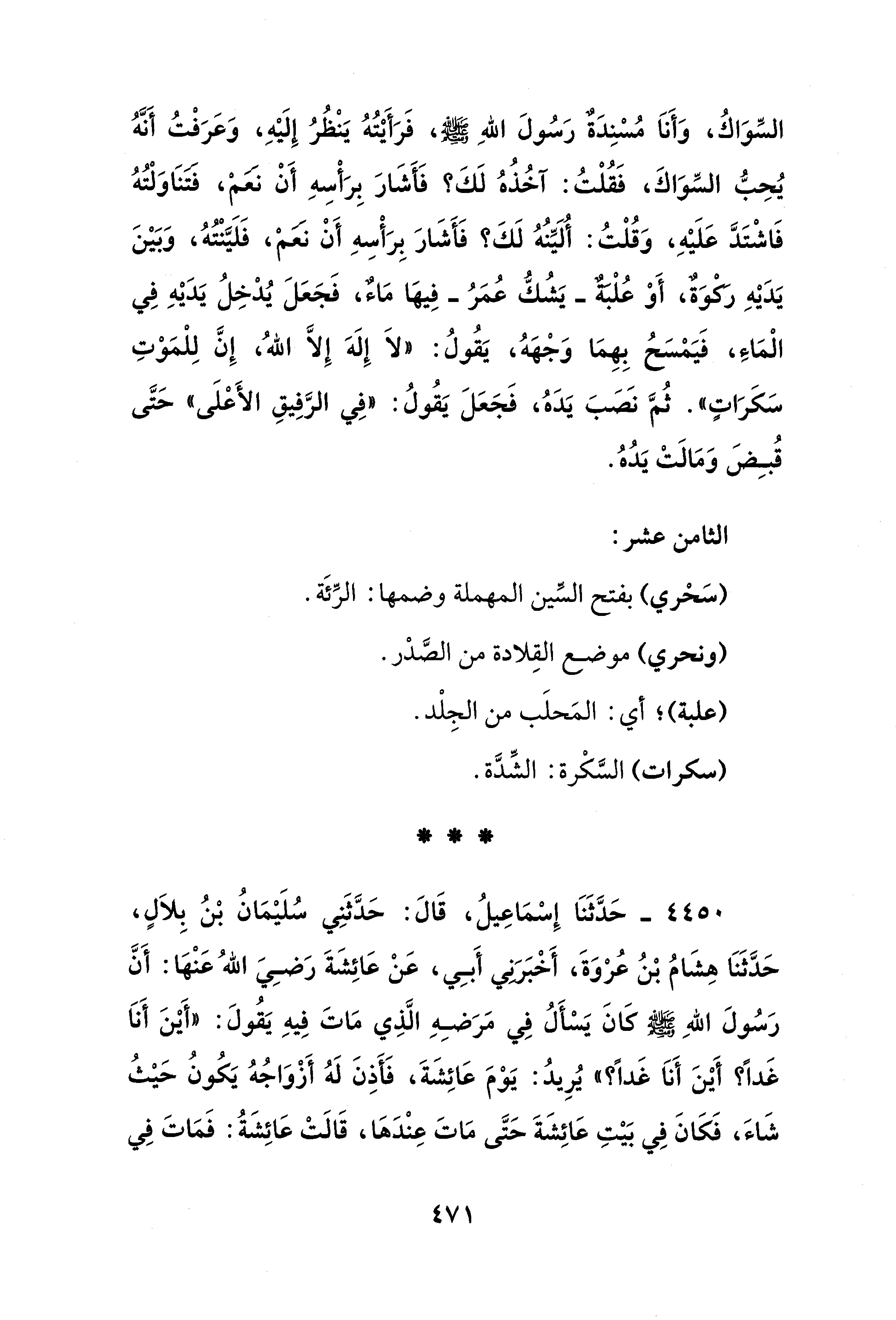 السِّوَاكُ، وَأَنَا مُسْنِدَةٌ رَسُولَ اللهِ - صلى الله عليه وسلم -، فَرَأَيْتُهُ يَنْظُرُ إِلَيْهِ، وَعَرَفْتُ أَنَّهُ يُحِبُّ السِّوَاكَ، فَقُلْتُ: آخُذُهُ لَكَ؟ فَأَشَارَ بِرَأْسهِ أَنْ نَعمْ، فتنَاوَلْتُهُ فَاشْتَدَّ عَلَيْهِ، وَقُلْتُ: أُلَيِّنُهُ لَكَ؟ فَأَشَارَ بِرَأْسهِ أَنْ نعمْ، فَلَيَّنْتُهُ، وَبَيْنَ يَدَيْهِ رَكْوَةٌ، أَوْ عُلْبَةٌ -يَشُكُّ عُمَرُ- فِيهَا مَاءٌ، فَجَعَلَ يُدْخِلُ يَدَيْهِ في الْمَاءِ، فَيَمْسَحُ بِهِمَا وَجْهَهُ، يَقُولُ: "لَا إِلَهَ إلا اللهُ، إِنَّ لِلْمَوْتِ سَكَرَاتٍ". ثُمَّ نَصَبَ يَدَهُ، فَجَعَلَ يَقُولُ: "فِي الرَّفِيقِ الأَعْلَى، حَتَّى قُبِضَ وَمَالَتْ يَدُهُ.