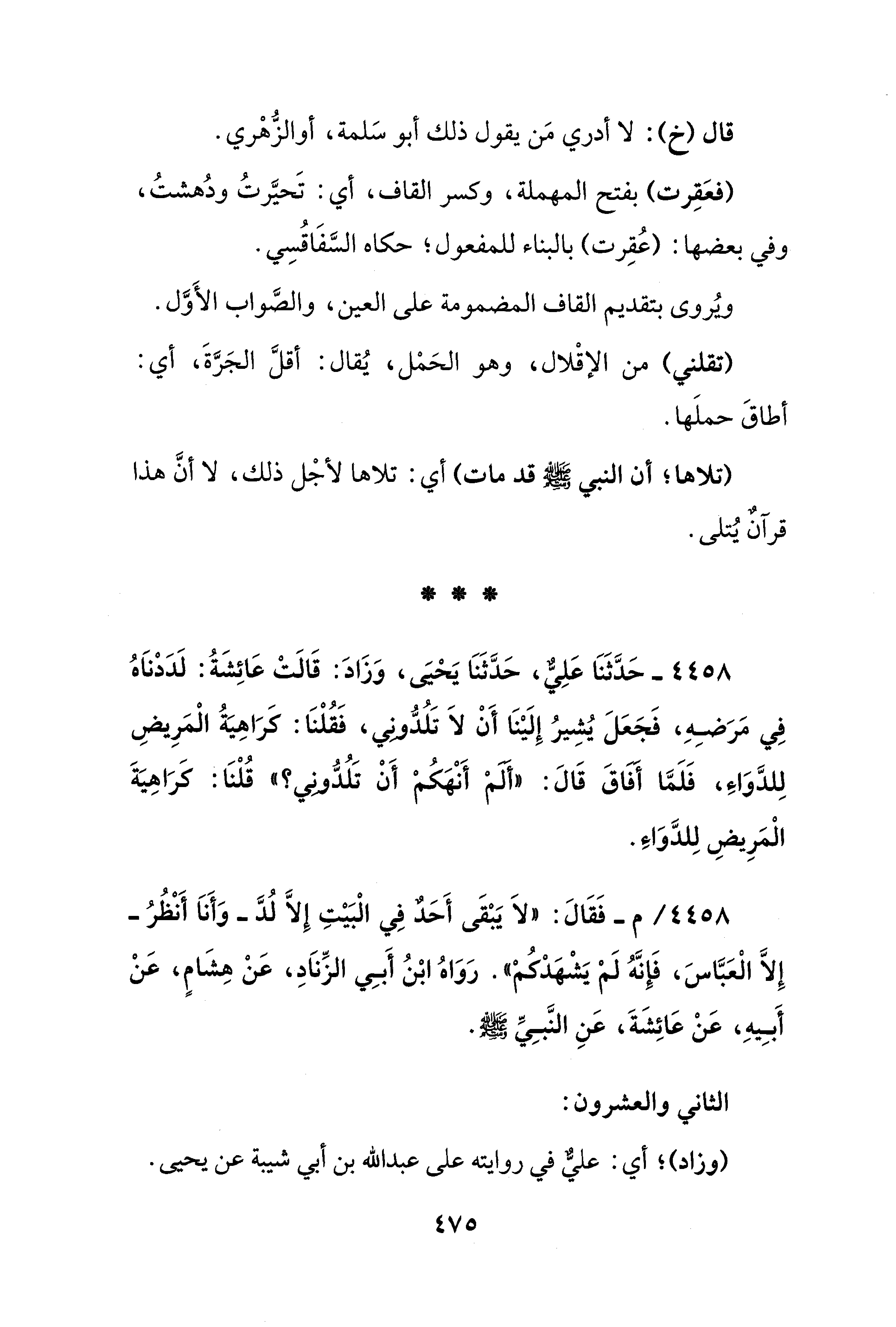 4458 / -م - فَقَالَ: "لَا يَبْقَى أَحَدٌ في الْبَيْتِ إلا لُدَّ -وَأَنَا أَنْظُرُ- إلا الْعَبَّاسَ، فَإنَّهُ لَمْ يَشْهَدْكمْ". رَوَاهُ ابْنُ أَبِي الزِّنَادِ، عَنْ هِشَامٍ، عَنْ أَبِيهِ، عَنْ عَائِشَةَ، عَنِ النَّبِيِّ - صلى الله عليه وسلم -.