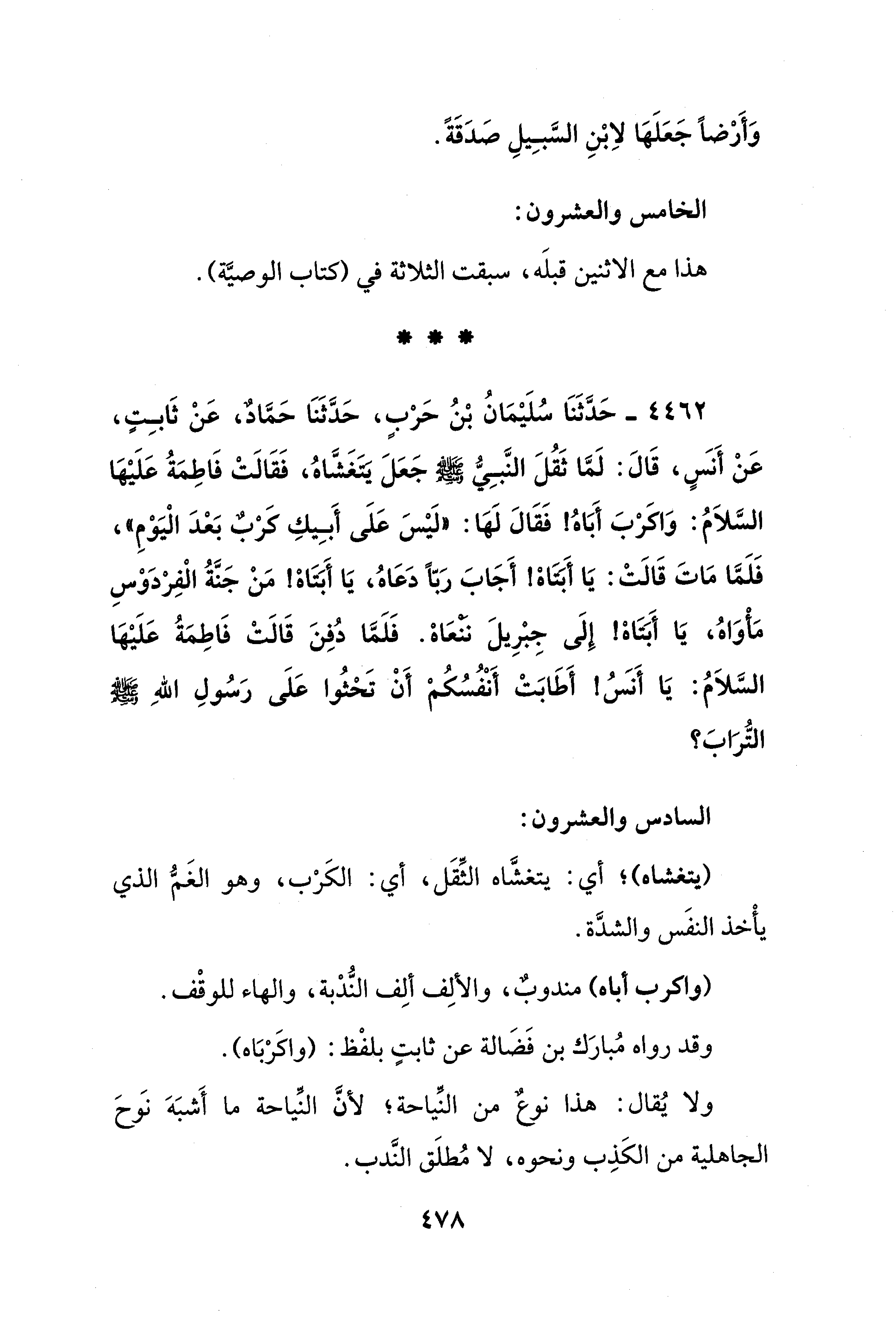 4462 - حَدَّثَنَا سُلَيْمَانُ بْنُ حَرْبٍ، حَدَّثَنَا حَمَّادٌ، عَنْ ثَابِتٍ، عَنْ أَنسٍ، قَالَ: لَمَّا ثَقُلَ النَّبِي - صلى الله عليه وسلم - جَعَلَ يَتَغَشَّاهُ، فَقَالَتْ فَاطِمَةُ عَلَيْهَا السَّلَامُ: وَاكَرْبَ أَبَاهُ! فَقَالَ لَهَا: "لَيْسَ عَلَى أَبِيكِ كَرْبٌ بَعْدَ الْيَوْمِ"، فَلَمَّا مَاتَ قَالَتْ: يَا أَبَتَاهْ! أَجَابَ رَبًّا دَعَاهُ، يَا أَبَتَاهْ! مَنْ جَنَّةُ الْفِرْدَوْسِ مَأْوَاهُ، يَا أَبَتَاهْ! إِلَى جِبْرِيلَ ننعَاهْ. فَلَمَّا دُفِنَ قَالَتْ فَاطِمَةُ عَلَيْهَا السَّلَامُ: يَا أَنسُ! أَطَابَتْ أَنْفُسُكُمْ أَنْ تَحْثُوا عَلَى رَسُولِ اللهِ - صلى الله عليه وسلم - التّرَابَ؟