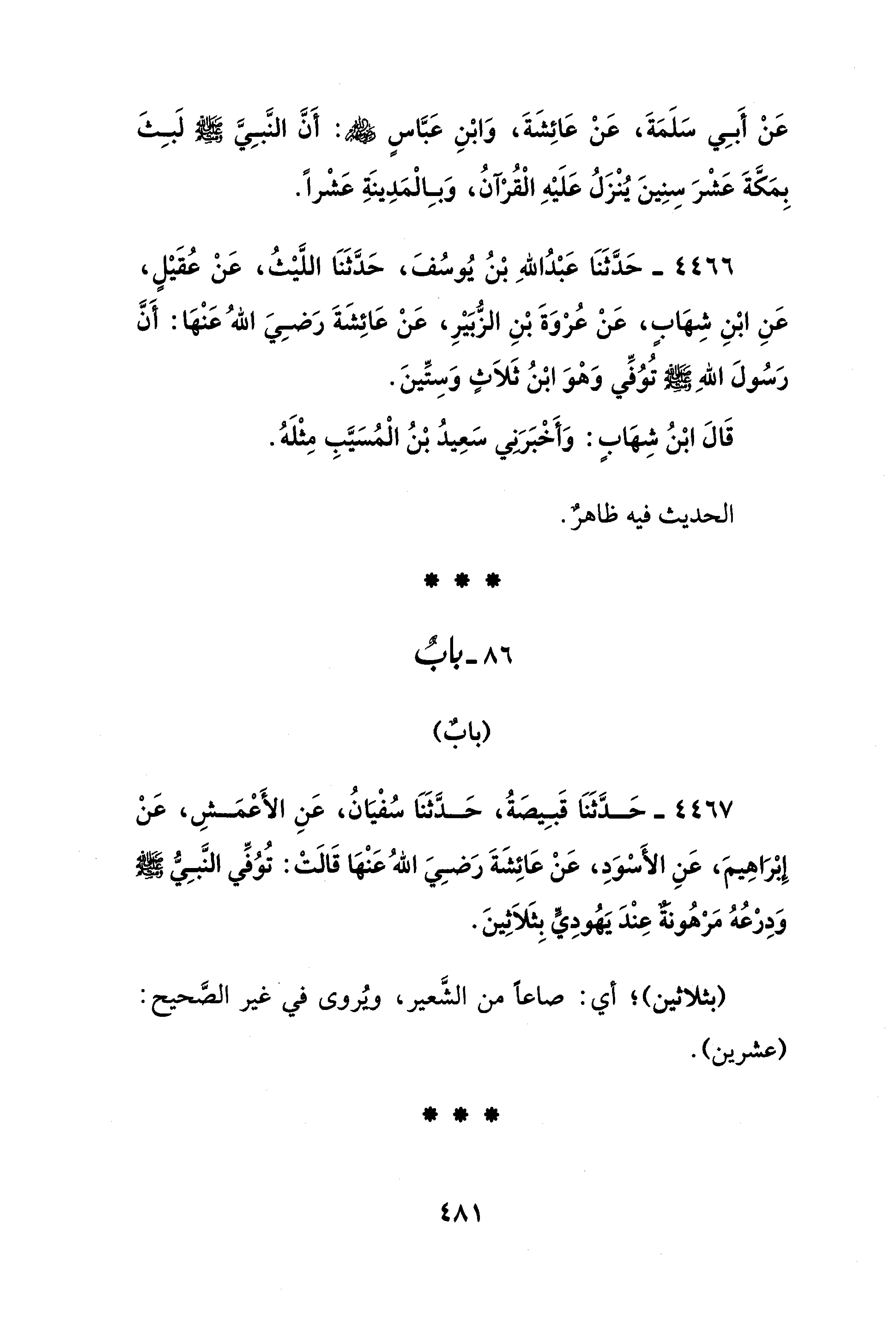 4466 - حَدَّثَنَا عَبْدُ اللهِ بْنُ يُوسُفَ، حَدَّثَنَا اللَّيْثُ، عَنْ عُقَيْلٍ، عَنِ ابْنِ شِهَابٍ، عَنْ عُرْوَةَ بْنِ الزُّبَيْرِ، عَنْ عَائِشَةَ رَضِيَ اللهُ عَنْهَا: أَنَّ رَسُولَ اللهِ - صلى الله عليه وسلم - تُوُفِّي وَهْوَ ابْنُ ثَلَاثٍ وَسِتِّينَ.