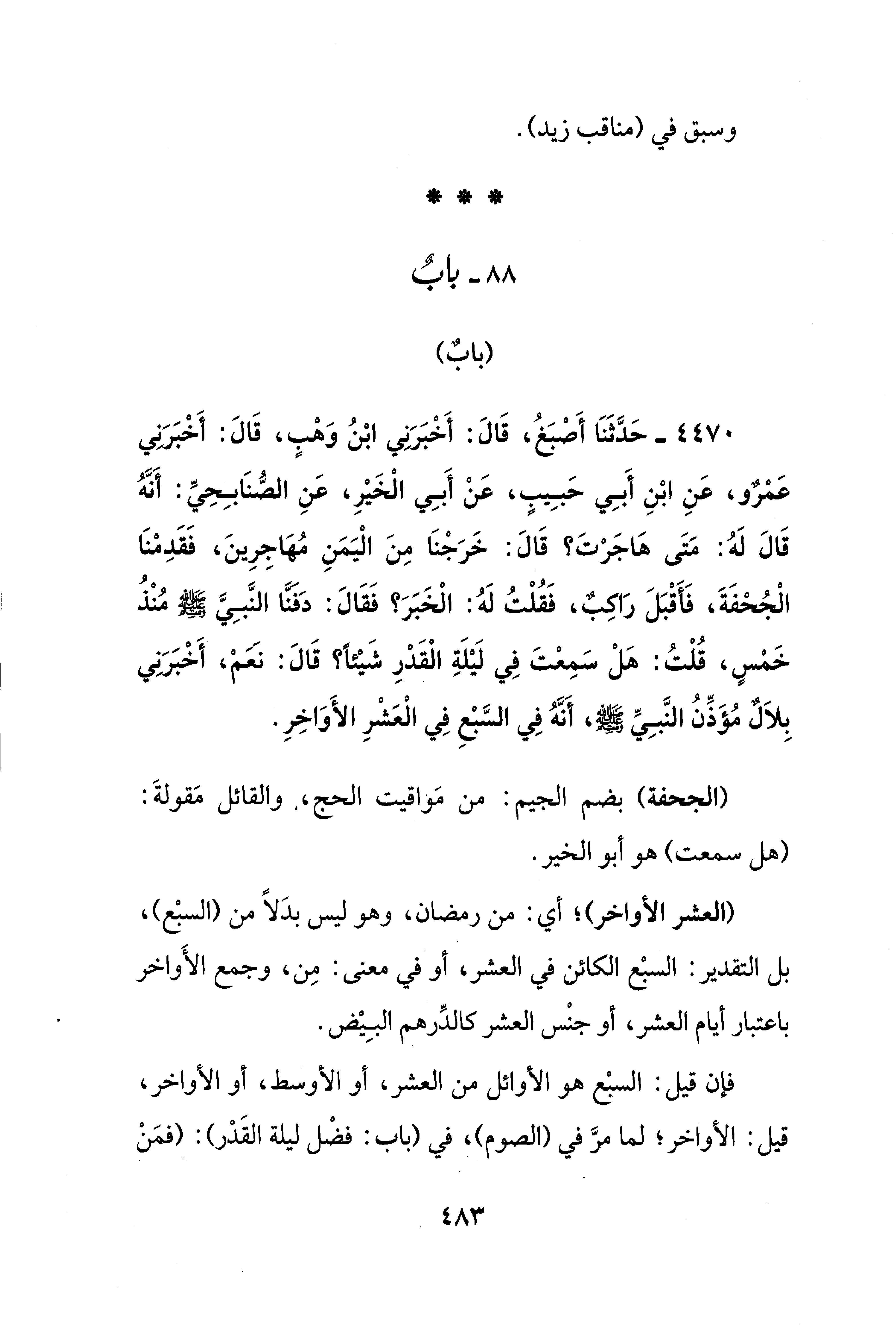 4470 - حَدَّثَنَا أَصْبَغُ، قَالَ: أَخْبَرَنِي ابْنُ وَهْبٍ، قَالَ: أَخْبَرَنِي عَمْرٌو، عَنِ ابْنِ أَبِي حَبِيبٍ، عَنْ أَبِي الْخَيْرِ، عَنِ الصُّنَابِحِيِّ: أَنَّهُ قَالَ لَهُ: مَتَى هَاجَرْتَ؟ قَالَ: خَرَجْنَا مِنَ الْيَمَنِ مُهَاجِرِينَ، فَقَدِمْنَا الْجُحْفَةَ، فَأَقْبَلَ رَاكِبٌ، فَقُلْتُ لَهُ: الْخَبَرَ؟ فَقَالَ: دَفَنَّا النَّبِيَّ - صلى الله عليه وسلم - مُنْذُ خَمْسٍ، قُلْتُ: هَلْ سَمِعْتَ في لَيْلَةِ الْقَدْرِ شَيْئًا؟ قَالَ: نعمْ، أَخْبَرَنِي بِلَالٌ مُؤَذِّنُ النَّبِيِّ - صلى الله عليه وسلم -، أَنَّهُ في السَّبعِ في الْعَشْرِ الأَوَاخِرِ.