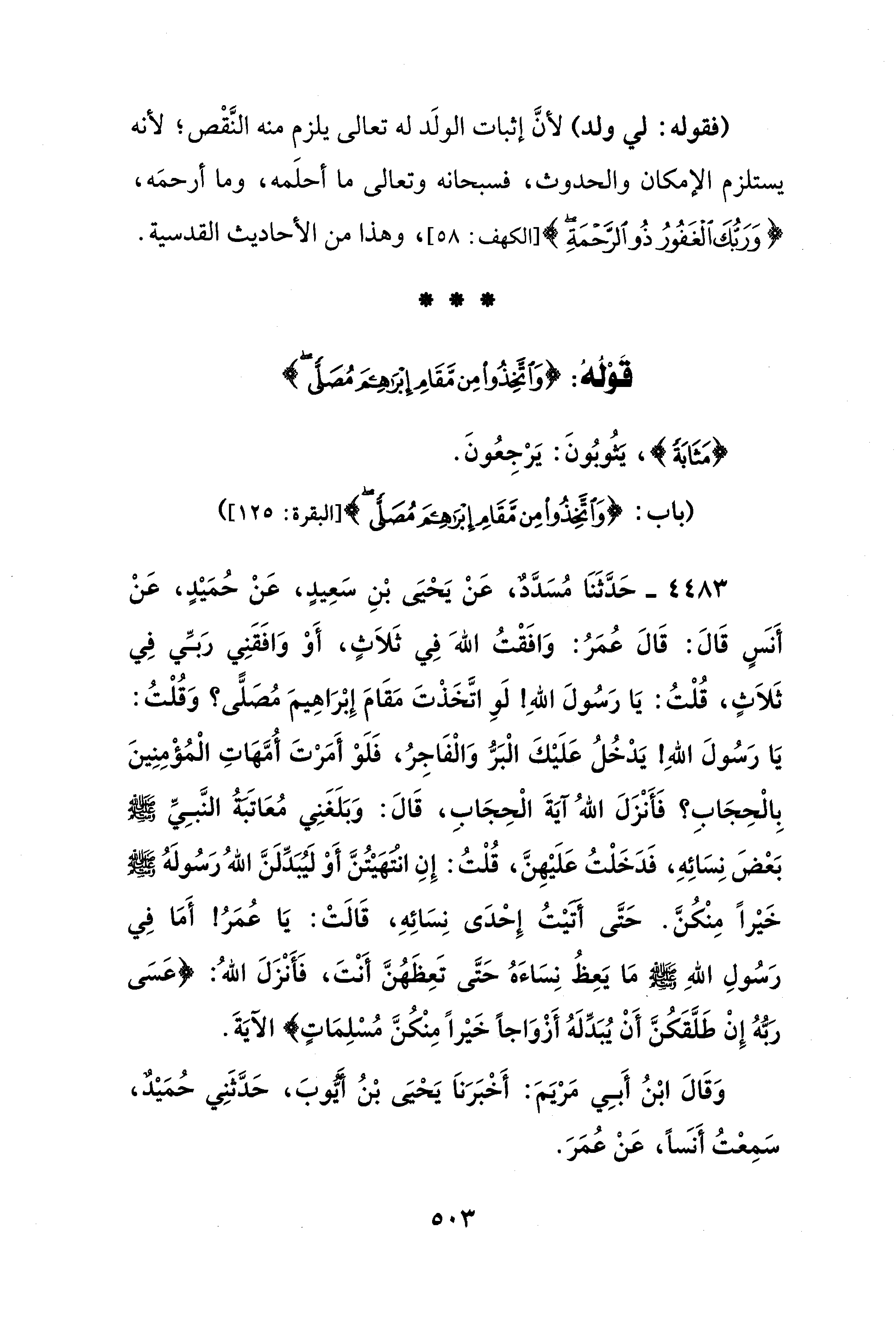 4483 - حَدَّثَنَا مُسَدَّدٌ، عَنْ يَحْيَى بْنِ سَعِيدٍ، عَنْ حُمَيْدٍ، عَنْ أَنسٍ قَالَ: قَالَ عُمَرُ: وَافَقْتُ الله في ثَلَاثٍ، أَوْ وَافَقَنِي رَبِّي في ثَلَاثٍ، قُلْتُ: يَا رَسُولَ اللهِ! لَوِ اتَّخَذْتَ مَقَامَ إِبْرَاهِيمَ مُصَلًّى؟ وَقُلْتُ: يَا رَسُولَ اللهِ! يَدْخُلُ عَلَيْكَ الْبَرُّ وَالْفَاجِرُ، فَلَوْ أَمَرْتَ أُمَّهَاتِ الْمُؤْمِنِينَ بِالْحِجَابِ؛ فَأَنْزَلَ اللهُ آيَةَ الْحِجَابِ، قَالَ: وَبَلَغَنِي مُعَاتَبَةُ النَّبِيِّ - صلى الله عليه وسلم - بَعْضَ نِسَائِهِ، فَدَخَلْتُ عَلَيْهِنَّ، قُلْتُ: إِنِ انْتَهَيْتُنَّ أَوْ لَيُبَدِّلَنَّ اللهُ رَسُولَهُ - صلى الله عليه وسلم - خَيْرًا مِنْكُنَّ. حَتَّى أتيْتُ إِحْدَى نِسَائِهِ، قَالَتْ: يَا عُمَرُ! أَمَا في رَسُولِ اللهِ - صلى الله عليه وسلم - مَا يَعِظُ نِسَاءَهُ حَتَّى تَعِظَهُنَّ أَنْتَ، فَأَنْزَلَ اللهُ: {عَسَى رَبُّهُ إِنْ طَلَّقَكُنَّ أَنْ يُبْدِلَهُ أَزْوَاجًا خَيْرًا مِنْكُنَّ مُسْلِمَاتٍ} الآيَةَ.