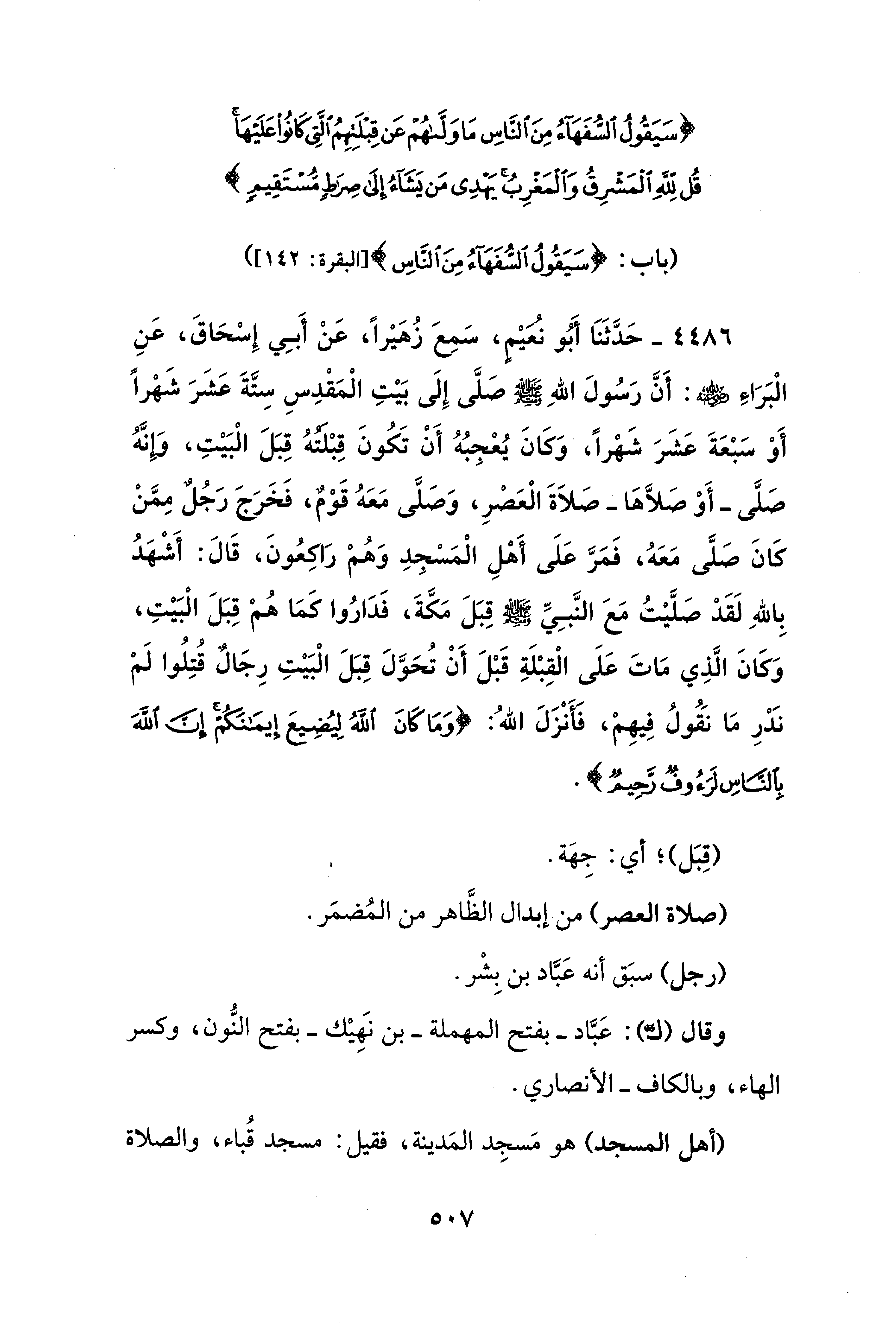4486 - حَدَّثَنَا أَبُو نعيْمٍ، سَمِعَ زُهيْرًا، عَنْ أَبِي إِسْحَاقَ، عَنِ الْبَرَاءِ - رضي الله عنه -: أَنَّ رَسُولَ اللهِ - صلى الله عليه وسلم - صَلَّى إِلَى بَيْتِ الْمَقْدِسِ سِتَّةَ عَشَرَ شَهْرًا أَوْ سَبْعَةَ عَشَرَ شَهْرًا، وَكَانَ يُعْجبُهُ أَنْ تَكُونَ قِبْلتهُ قِبَلَ الْبَيْتِ، وَإِنَّهُ صَلَّى -أَوْ صَلَّاهَا- صَلَاةَ الْعَصْرِ، وَصَلَّى مَعَهُ قَوْمٌ، فَخَرَجَ رَجُلٌ مِمَّنْ كَانَ صَلَّى مَعَهُ، فَمَرَّ عَلَى أَهْلِ الْمَسْجدِ وَهُمْ رَاكِعُونَ، قَالَ: أَشْهَدُ بِاللهِ لَقَدْ صَلَّيْتُ مَعَ النَّبِيِّ - صلى الله عليه وسلم - قِبَلَ مَكَّةَ، فَدَارُوا كَمَا هُمْ قِبَلَ الْبَيْتِ، وَكَانَ الَّذِي مَاتَ عَلَى الْقِبْلَةِ قَبْلَ أَنْ تُحَوَّلَ قِبَلَ الْبَيْتِ رِجَالٌ قُتِلُوا لَمْ نَدْرِ مَا نَقُولُ فِيهِمْ، فَأَنْزَلَ اللهُ: {وَمَا كَانَ اللَّهُ لِيُضِيعَ إِيمَانَكُمْ إِنَّ اللَّهَ بِالنَّاسِ لَرَءُوفٌ رَحِيمٌ}.