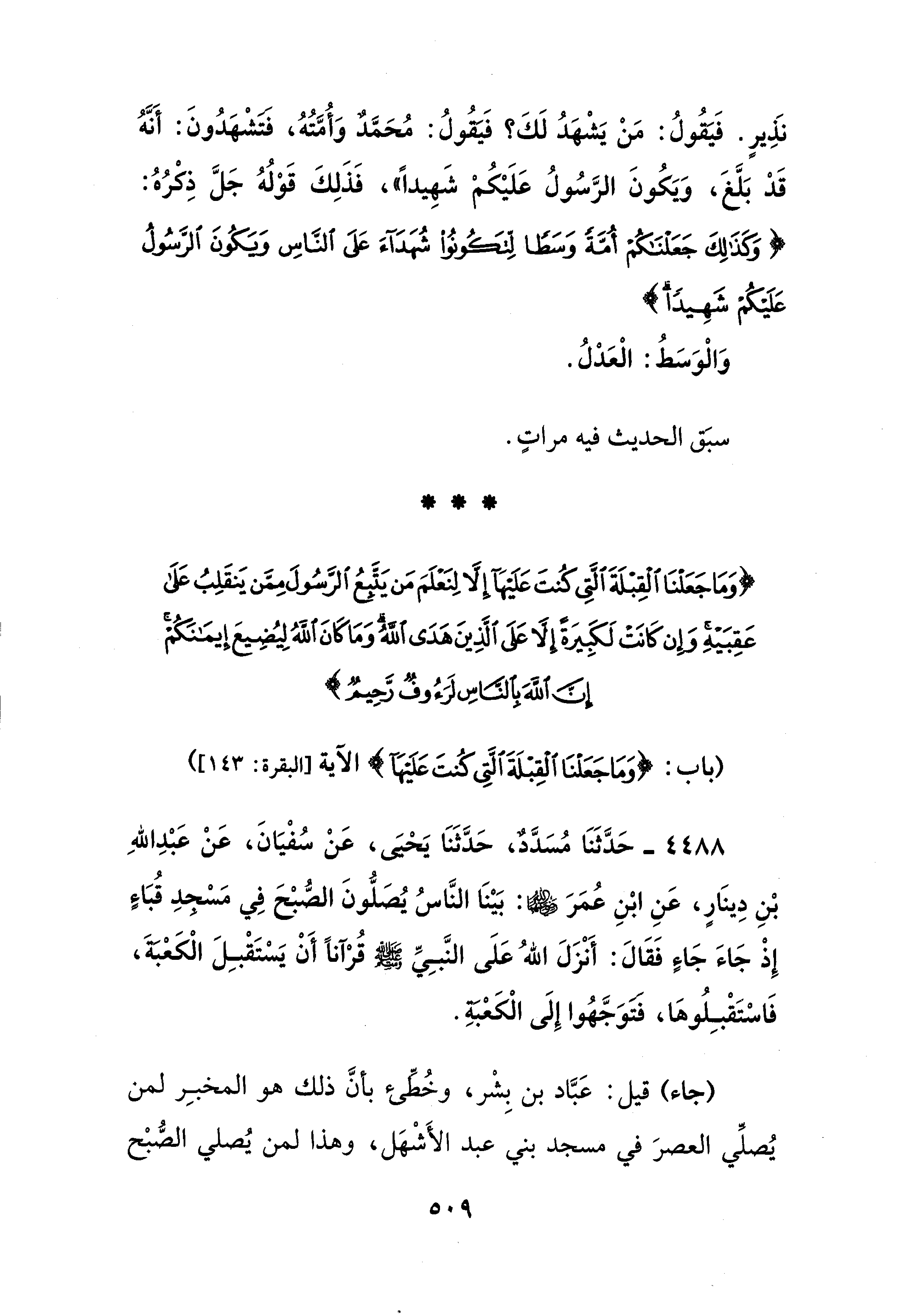 4488 - حَدَّثَنَا مُسَدَّدٌ، حَدَّثَنَا يَحْيَى، عَنْ سُفْيَانَ، عَنْ عَبْدِ اللهِ بْنِ دِينَارٍ، عَنِ ابْنِ عُمَرَ - رضي الله عنهما -: بَيْنَا النَّاسُ يُصَلُّونَ الصُّبْحَ في مَسْجدِ قُبَاءٍ إِذْ جَاءَ جَاءٍ فَقَالَ: أَنْزَلَ اللهُ عَلَى النَّبِيِّ - صلى الله عليه وسلم - قُرْآنًا أَنْ يَسْتَقْبِلَ الْكَعْبَةَ، فَاسْتَقْبِلُوهَا، فتوَجَّهُوا إِلَى الْكَعْبَةِ.