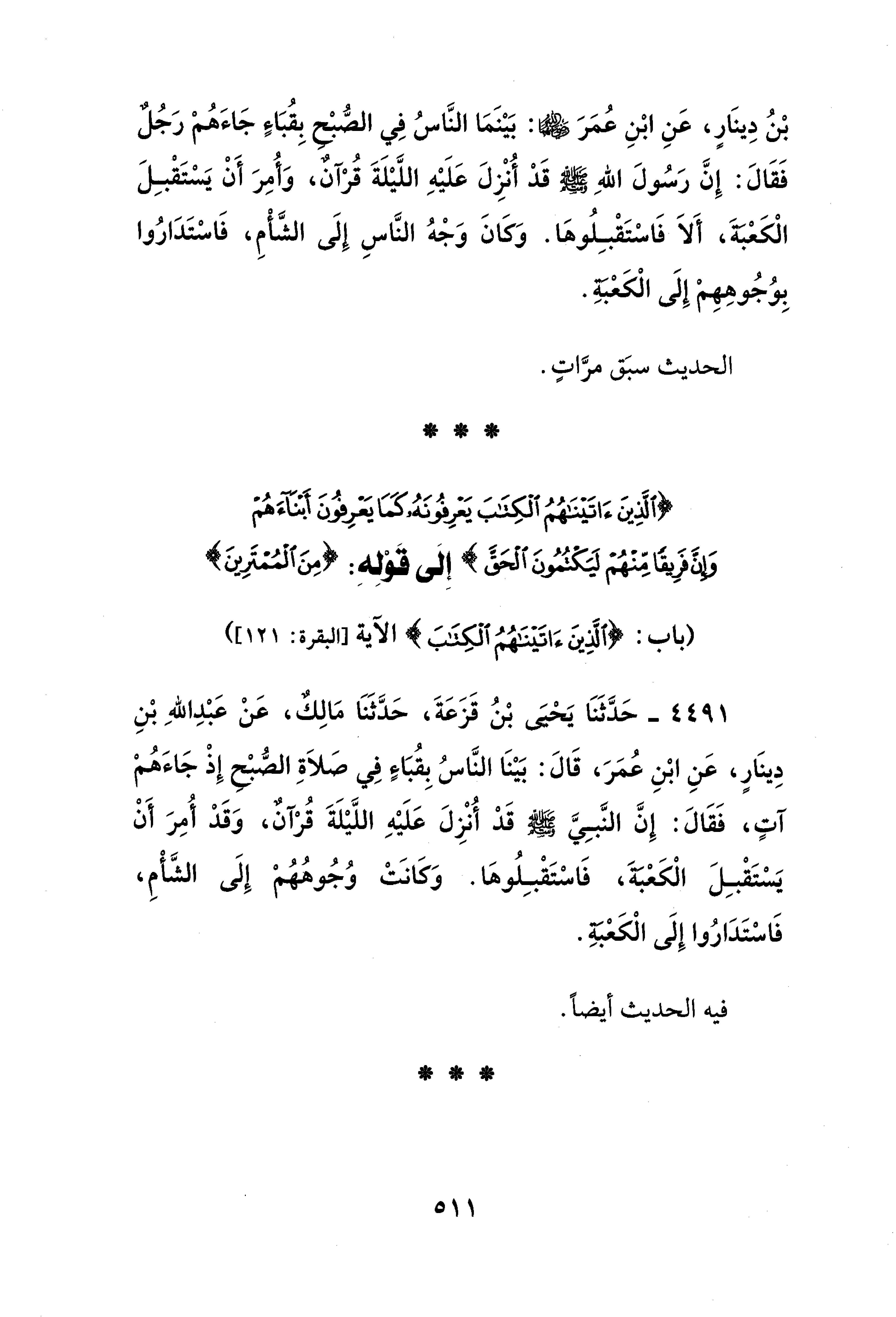 4491 - حَدَّثَنَا يَحْيَى بْنُ قَزَعَةَ، حَدَّثَنَا مَالِكٌ، عَنْ عَبْدِ اللهِ بْنِ دِينَارٍ، عَنِ ابْنِ عُمَرَ، قالَ: بَيْنَا النَّاسُ بِقُبَاءٍ في صَلَاةِ الصُّبْح إِذْ جَاءَهُمْ آتٍ، فَقَالَ: إِنَّ النَّبِيَّ - صلى الله عليه وسلم - قَدْ أُنْزِلَ عَلَيْهِ اللَّيْلَةَ قُرْآن، وَقَدْ أُمِرَ أَنْ يَسْتَقْبِلَ الْكَعْبَةَ، فَاسْتَقْبِلُوهَا. وَكانَتْ وُجُوهُهُمْ إِلَى الشَّأْمِ، فَاسْتَدَارُوا إِلَى الْكَعْبَةِ.