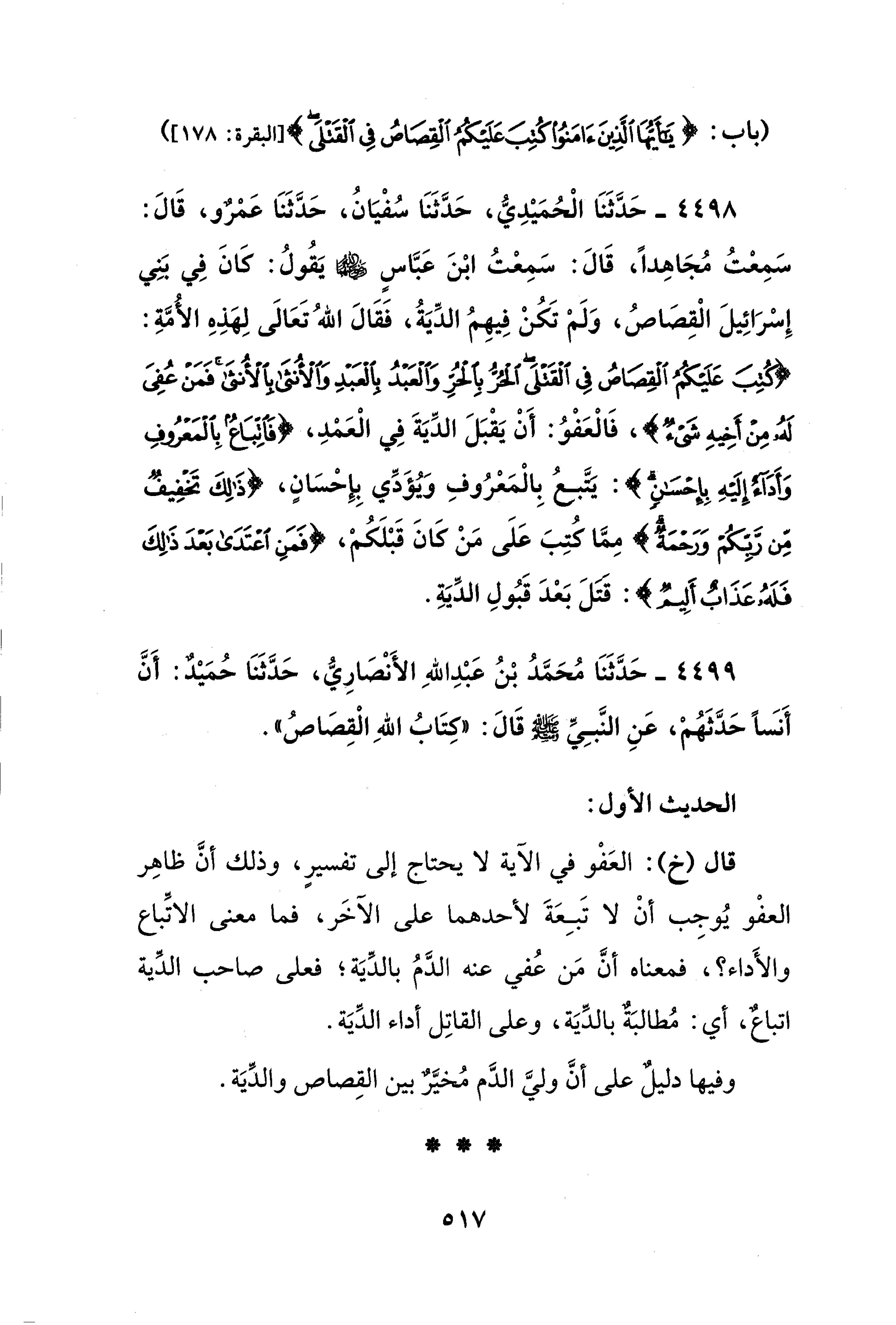 4499 - حَدَّثَنَا مُحَمَّدُ بْنُ عَبْدِ اللهِ الأَنْصَارِيُّ، حَدَّثَنَا حُمَيْدٌ: أَنَّ أَنَسًا حَدَّثَهُمْ، عَنِ النَّبِيِّ - صلى الله عليه وسلم - قَالَ: "كتَابُ اللهِ الْقِصَاصُ".