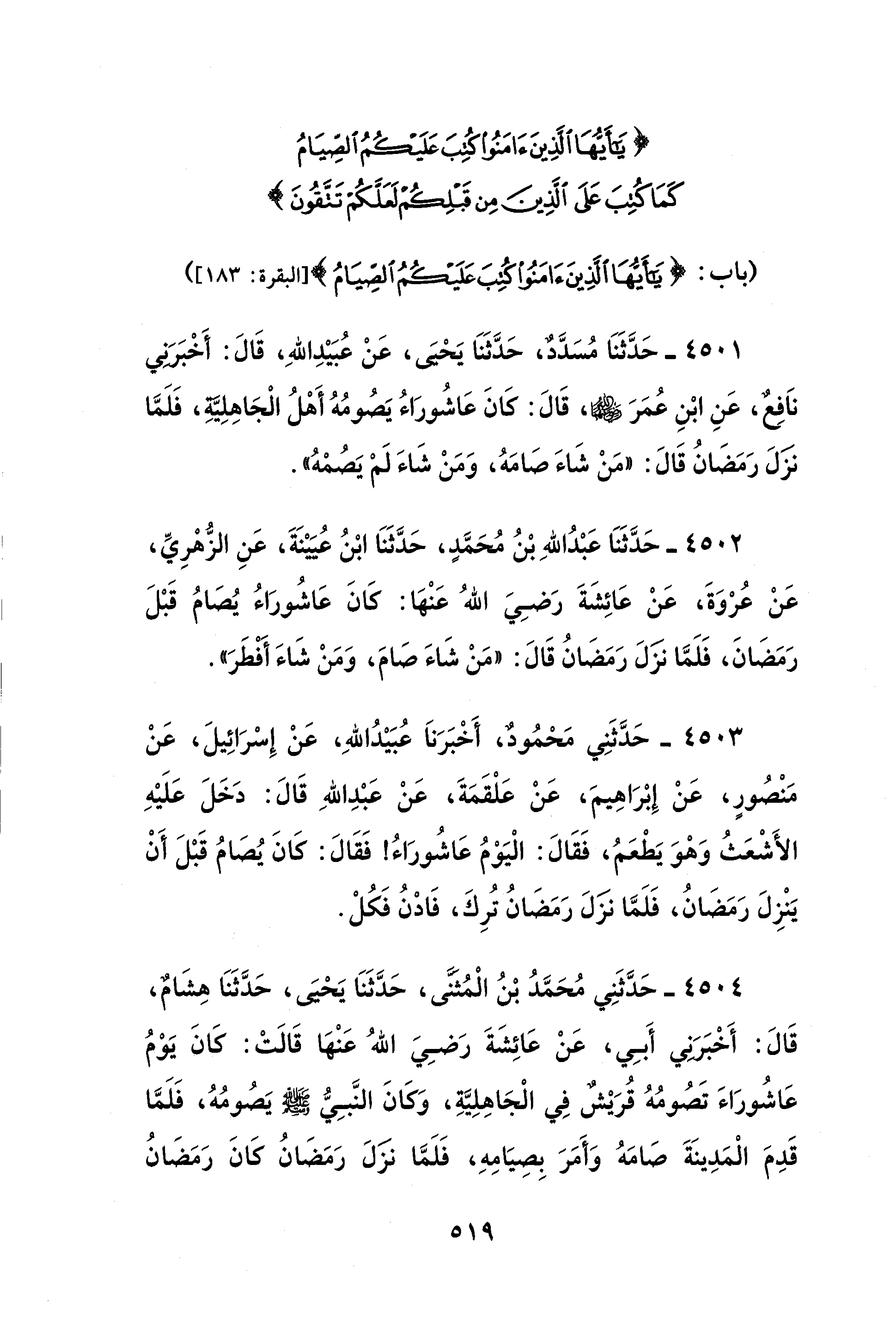 4501 - حَدَّثَنَا مُسَدَّدٌ، حَدَّثَنَا يَحْيَى، عَنْ عُبَيْدِ اللهِ، قَالَ: أَخْبَرَنِي نَافِعٌ، عَنِ ابْنِ عُمَرَ - رضي الله عنهما -، قَالَ: كَانَ عَاشُورَاءُ يَصُومُهُ أَهْلُ الْجَاهِلِيَّةِ، فَلَمَّا نزَلَ رَمَضَانُ قَالَ: "مَنْ شَاءَ صَامَهُ، وَمَنْ شَاءَ لَمْ يَصُمْهُ".