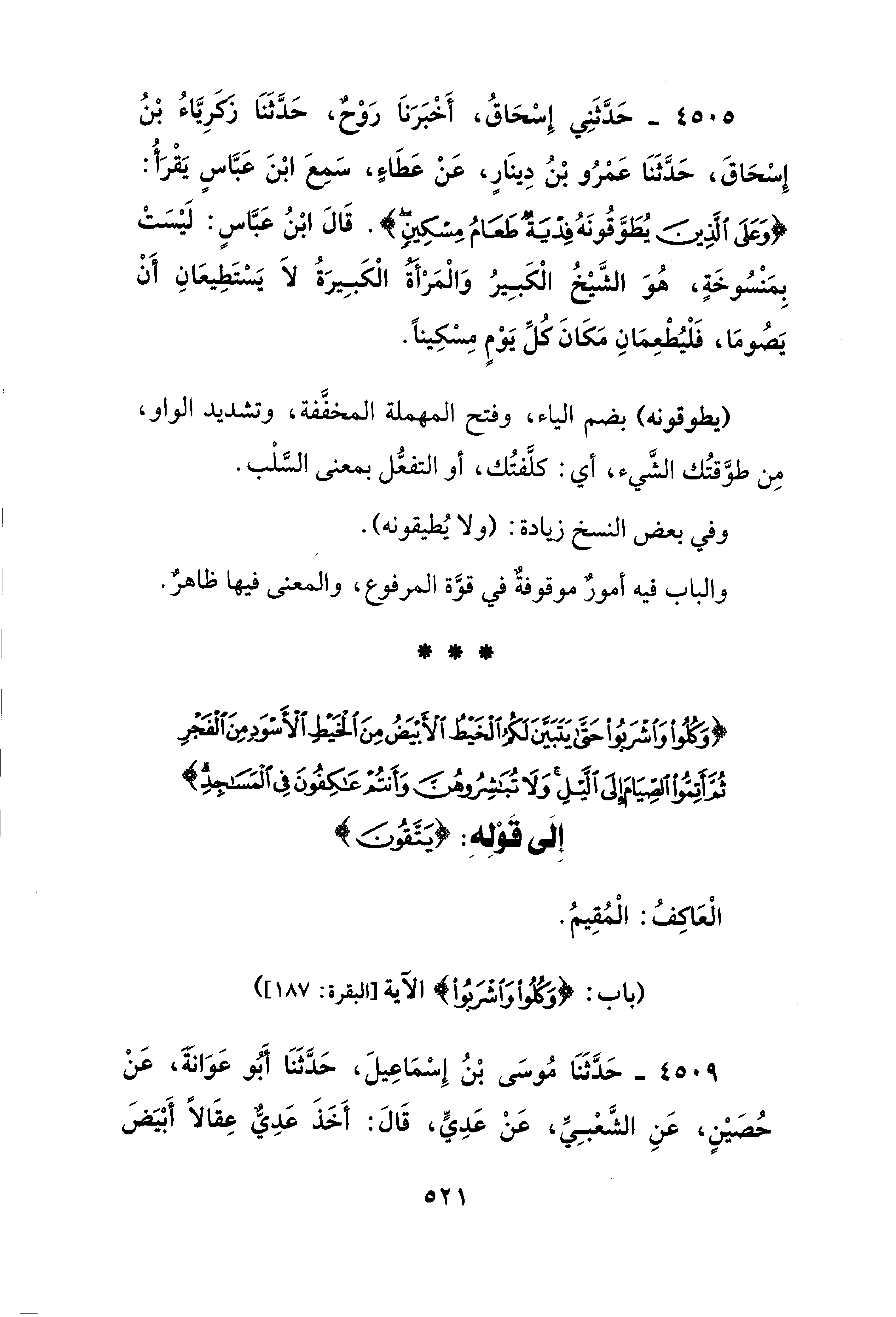 {وَكُلُوا وَاشْرَبُوا حَتَّى يَتَبَيَّنَ لَكُمُ الْخَيْطُ الْأَبْيَضُ مِنَ الْخَيْطِ الْأَسْوَدِ مِنَ الْفَجْرِ ثُمَّ أَتِمُّوا الصِّيَامَ إِلَى اللَّيْلِ وَلَا تُبَاشِرُوهُنَّ وَأَنْتُمْ عَاكِفُونَ فِي الْمَسَاجِدِ} إلى قوله: {يَتَّقُونَ}