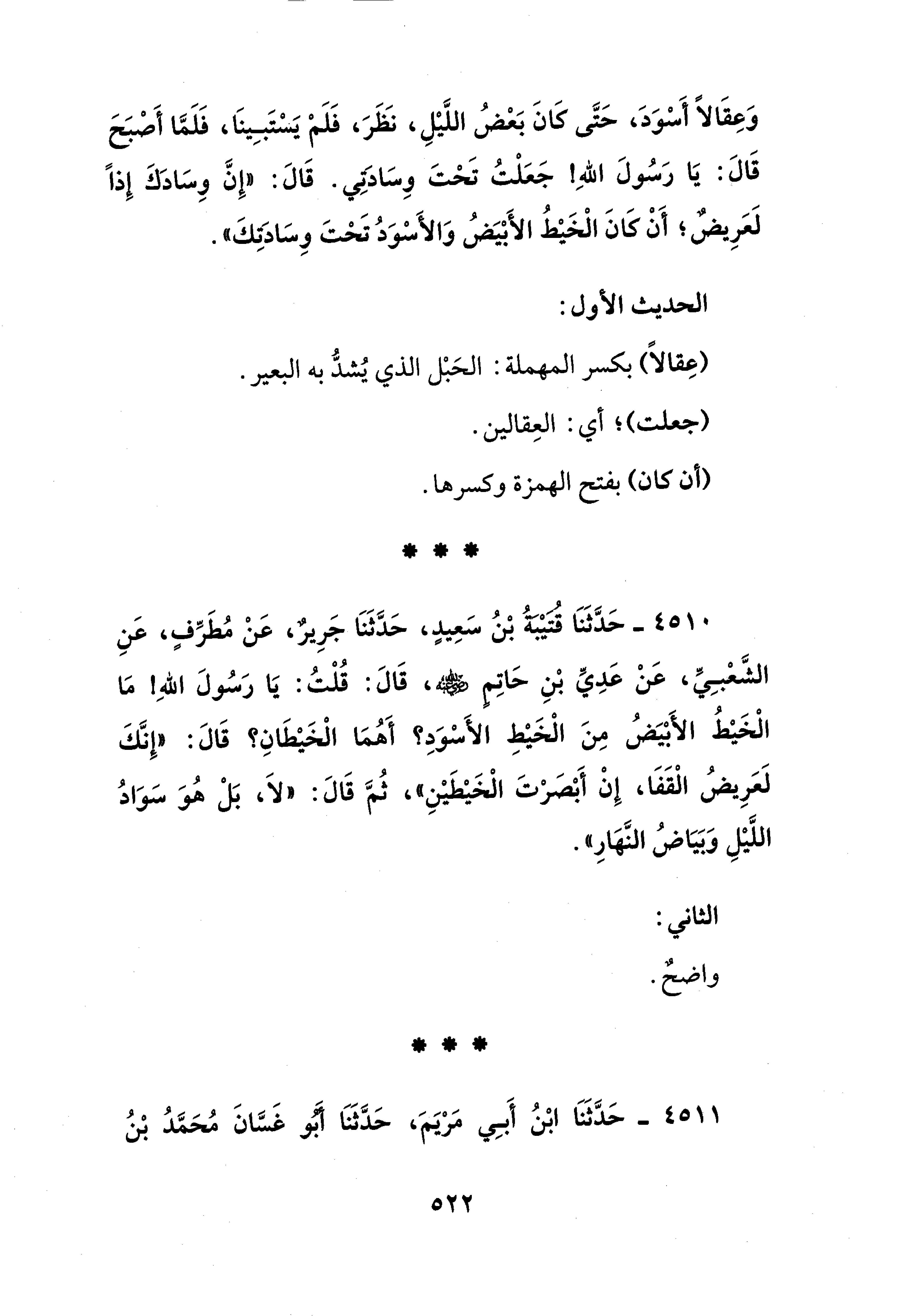 4510 - حَدَّثَنَا قُتَيْبةُ بْنُ سَعِيدٍ، حَدَّثَنَا جَرِيرٌ، عَنْ مُطَرِّفٍ، عَنِ الشَّعْبِيِّ، عَنْ عَدِيِّ بْنِ حَاتِمِ - رضي الله عنه -، قَالَ: قُلْتُ: يَا رَسُولَ اللهِ! مَا الْخَيْطُ الأَبْيَضُ مِنَ الْخَيْطِ الأَسْوَدِ؟ أَهُمَا الْخَيْطَانِ؟ قَالَ: "إِنَّكَ لَعَرِيضُ الْقَفَا، إِنْ أَبْصَرْتَ الْخَيْطَيْنِ"، ثُمَّ قَالَ: "لا، بَلْ هُوَ سَوَادُ اللَّيْلِ وَبَيَاضُ النَّهَارِ".