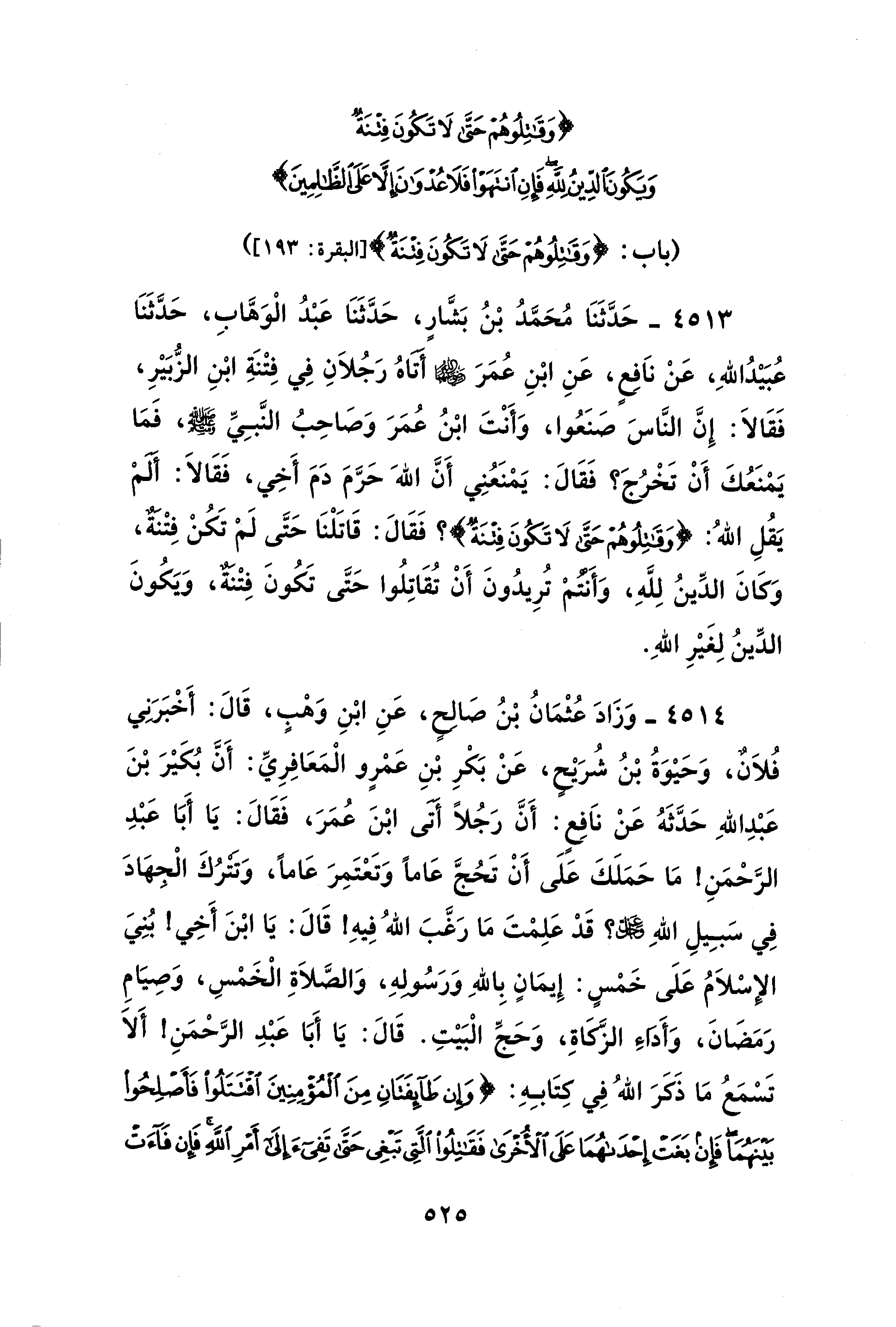 4513 - حَدَّثَنَا مُحَمَّدُ بْنُ بَشَّارٍ، حَدَّثَنَا عَبْدُ الْوَهَّابِ، حَدَّثَنَا عُبَيْدُ اللهِ، عَنْ نَافِعٍ، عَنِ ابْنِ عُمَرَ - رضي الله عنهما - أَتَاهُ رَجُلاَنِ فِي فِتْنَةِ ابْنِ الزُّبَيْرِ، فَقَالاَ: إِنَّ النَّاسَ صَنَعُوا، وَأَنْتَ ابْنُ عُمَرَ وَصَاحِبُ النَّبِيِّ - صلى الله عليه وسلم -، فَمَا يَمْنَعُكَ أَنْ تَخْرُجَ؟ فَقَالَ: يَمْنَعُنِي أَنَّ اللهَ حَرَّمَ دَمَ أَخِي، فَقَالاَ: أَلَمْ يَقُلِ اللهُ: {وَقَاتِلُوهُمْ حَتَّى لَا تَكُونَ فِتْنَةٌ}؟ فَقَالَ: قَاتَلْنَا حَتَّى لَمْ تَكُنْ فِتْنة، وَكانَ الدِّينُ لِلَّهِ، وَأَنتمْ تُرِيدُونَ أَنْ تُقَاتِلُوا حَتَّى تَكُونَ فِتْنة، وَيَكُونَ الدِّينُ لِغَيْرِ اللهِ.
