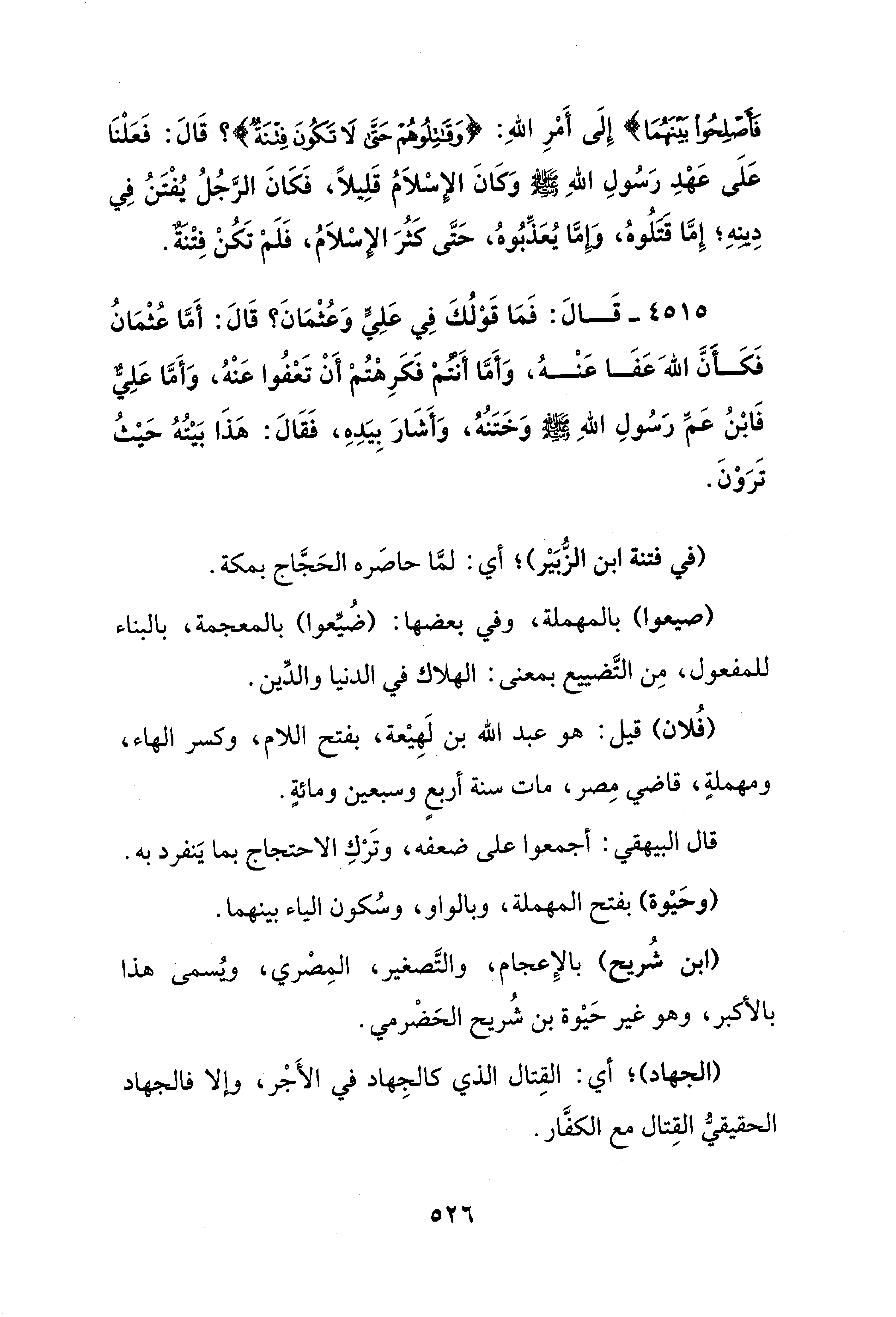 فَأَصْلِحُوا بَيْنَهُمَا} إِلَى أَمْرِ اللهِ: {وَقَاتِلُوهُمْ حَتَّى لَا تَكُونَ فِتْنَةٌ}؟ قَالَ: فَعَلْنَا عَلَى عَهْدِ رَسُولِ اللهِ - صلى الله عليه وسلم - وَكَانَ الإِسْلاَمُ قَلِيلًا، فَكَانَ الرَّجُلُ يُفْتَنُ فِي دِينِهِ؛ إِمَّا قَتَلُوهُ، وَإِمَّا يُعَذِّبُوهُ، حَتَّى كَثُرَ الإِسْلاَمُ، فَلَمْ تَكُنْ فِتْنَةٌ.