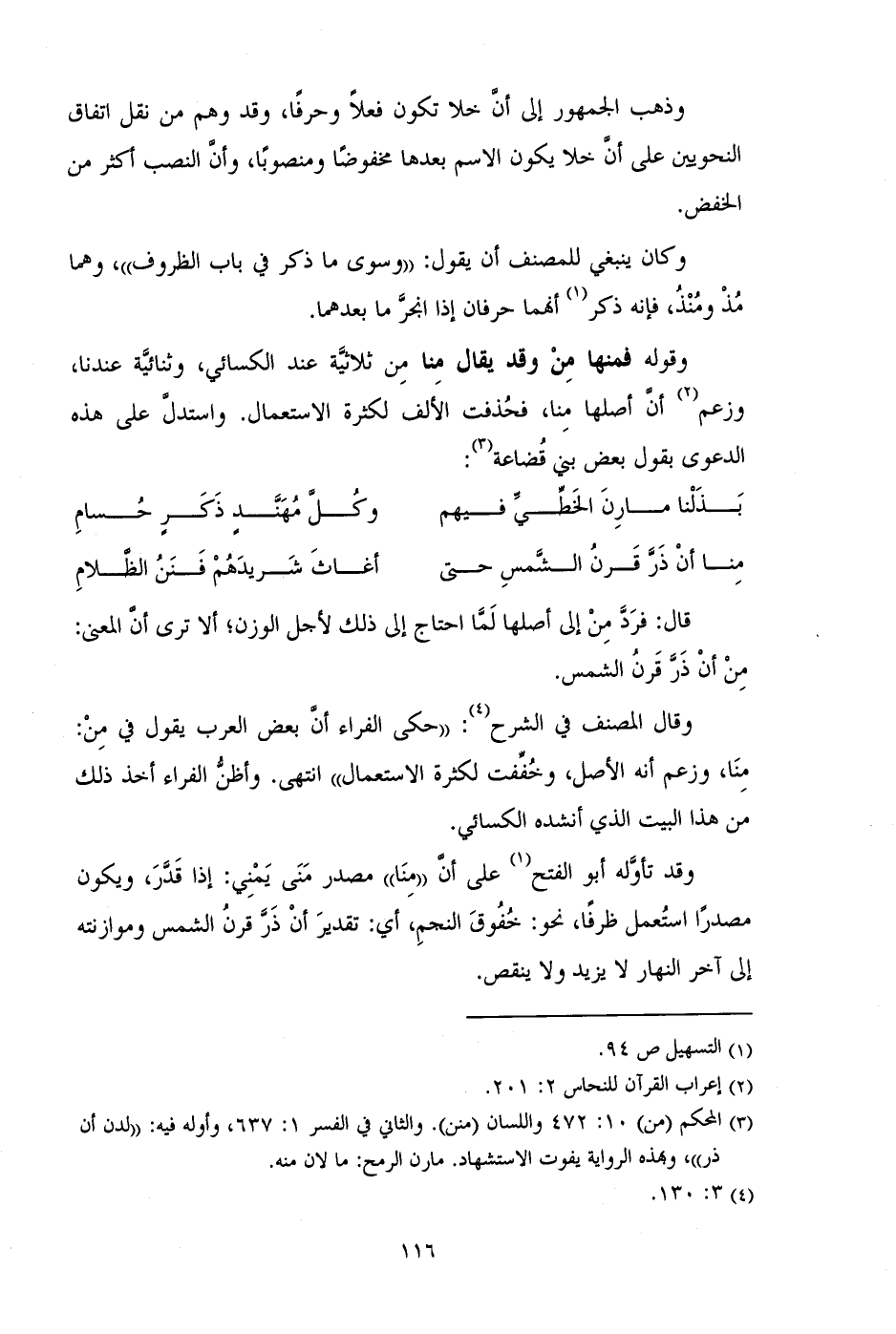 وقوله فمنها من وقد يقال منا من ثلاثية عند الكسائي، وثنائية عندنا، وزعم أن أصلها منا، فحذفت الألف لكثرة الاستعمال. واستدل على هذه الدعوى بقول بعض بني قضاعة:
