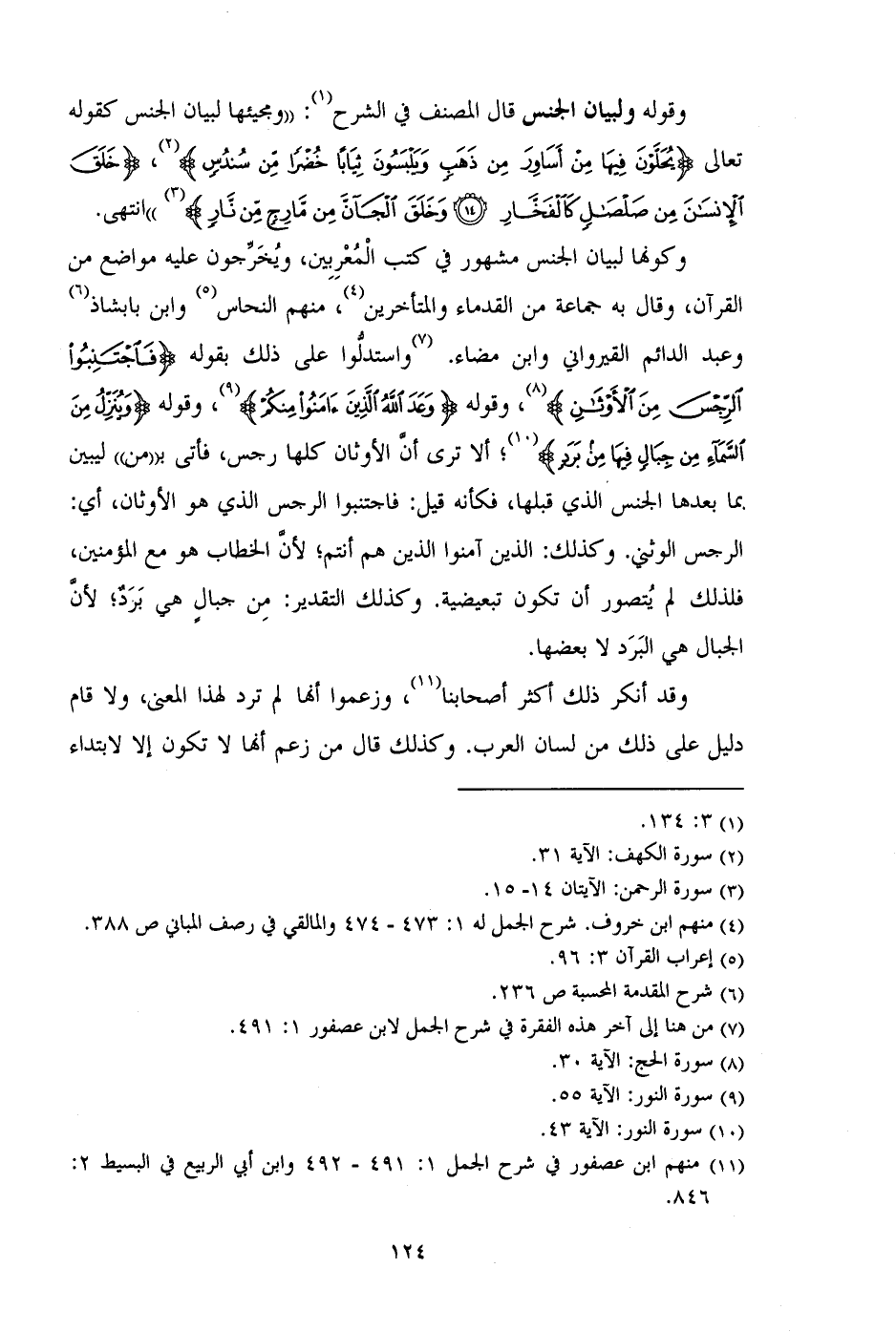 وكونها لبيان الجنس مشهور في كتب المعربين، ويخرجون عليه مواضع من القرآن، وقال به جماعة من القدماء والمتأخرين، منهم النحاس، وابن بابشاذ وعبد الدائم القيرواني وابن مضاء. واستدلوا على ذلك بقوله (فَاجْتَنِبُوا الرِّجْسَ مِنَ الْأَوْثَانِ)، وقوله (وَعَدَ اللَّهُ الَّذِينَ آَمَنُوا مِنْكُمْ)، وقوله (وَيُنَزِّلُ مِنَ السَّمَاءِ مِنْ جِبَالٍ فِيهَا مِنْ بَرَدٍ)؛ ألا ترى أن الأوثان كلها رجس، فأتى بـ"من" ليبين بما بعدها الجنس الذي قبلها، فكأنه قيل: فاجتنبوا الرجس الذي هو الأوثان، أي: الرجس الوثني. وكذلك: الذين آمنوا الذين هم أنتم؛ لأن الخطاب هو مع المؤمنين، فلذلك لم يتصور أن تكون تبعيضية. وكذلك التقدير: من جبال هي برد؛ لأن الجبال هي البرد لا بعضها.