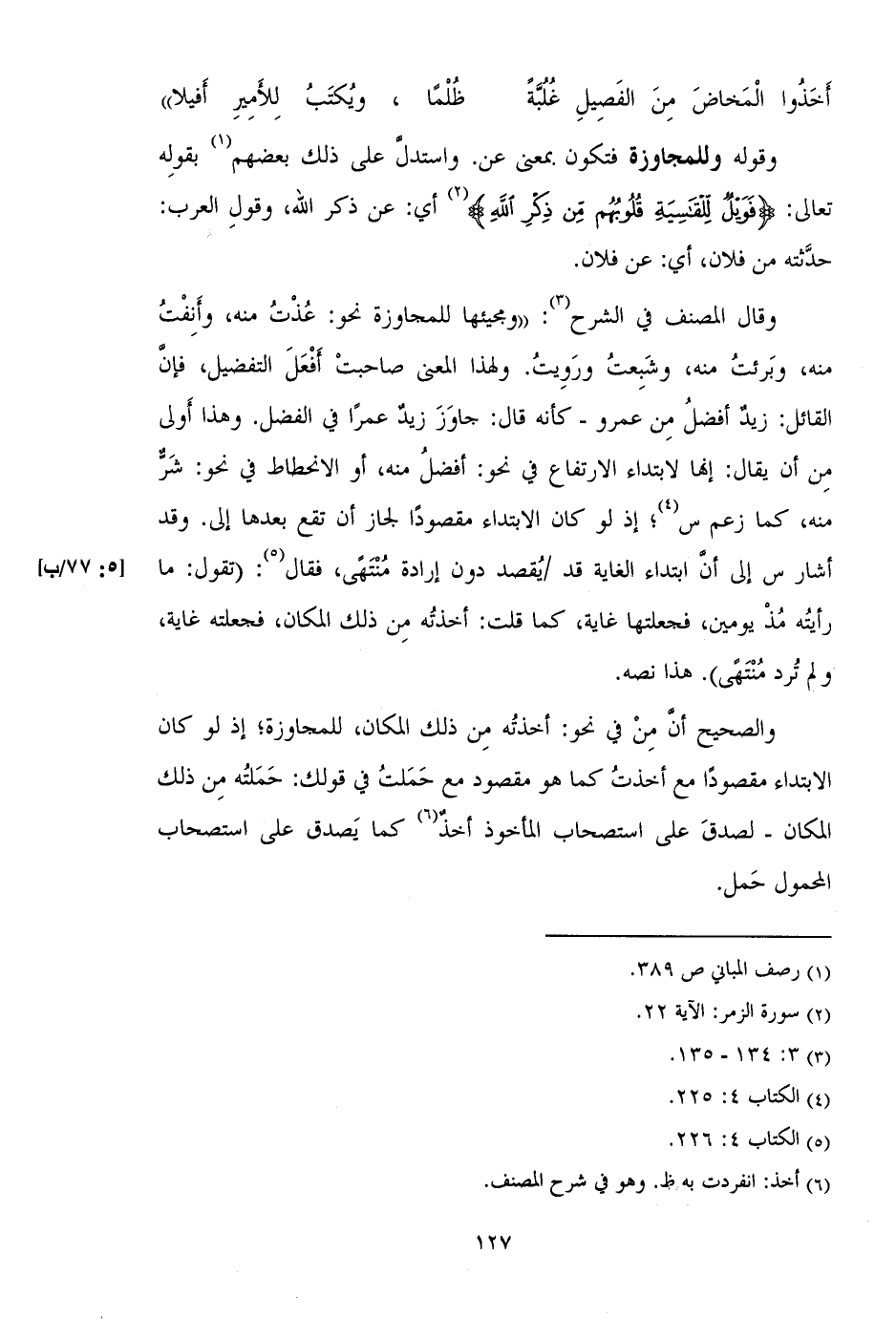 والصحيح أن من في نحو: أخذته من ذلك المكان، للمجاوزة؛ إذ لو كان الابتداء مقصوداً مع أخذت كما هو مقصود مع حملت في قولك: حملته من ذلك المكان - لصدق على استصحاب المأخوذ أخذ كما يصدق على استصحاب المحمول حمل.