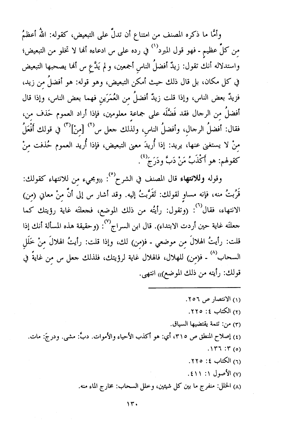 وقوله وللانتهاء قال المصنف في الشرح: "ومجيء من للانتهاء كقولك: قربت منه، فإنه مساو لقولك: تقربت إليه. وقد أشار س إلى أن من معاني (من) الانتهاء، فقال: (وتقول: رأيته من ذلك الموضع، فجعلته غاية رؤيتك كما جعلته غاية حين أردت الابتداء). قال ابن السراج: (وحقيقة هذه المسألة أنك إذا قلت: رأيت الهلال من موضعي - فـ (من) لك، وإذا قلت: رأيت الهلال من خلل السحاب - فـ (من) للهلال، فالهلال غاية لرؤيتك، فلذلك جعل س من غاية في قولك: رأيته من ذلك الموضع) " انتهى.