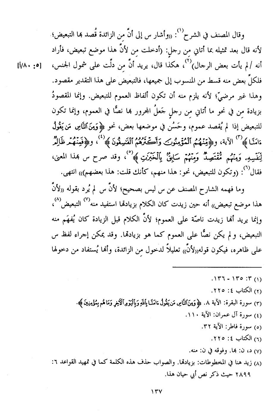 وقال المصنف في الشرح: "وأشار س إلى أن من الزائدة قصد بها التبعيض؛ لأنه قال بعد تمثيله بما أتاني من رجل: (أدخلت من لأن هذا موضع تبعيض، فأراد أنه /لم يأت بعض الرجال)، هكذا قال، يريد أن من دلت على شمول الجنس، فلكل بعض منه قسط من المنسوب إلى جميعها، فالتبعيض على هذا التقدير مقصود. وهذا غير مرضي؛ لأنه يلزم منه أن تكون ألفاظ العموم للتبعيض. وإنما المقصود بزيادة من في نحو ما أتاني من رجل جعل المجرور بها نصاً في العموم، وإنما تكون للتبعيض إذا لم يقصد عموم، وحسن في موضعها بعض، نحو (وَمِنَ النَّاسِ مَنْ يَقُولُ آَمَنَّا) الآية، و (مِنْهُمُ الْمُؤْمِنُونَ وَأَكْثَرُهُمُ الْفَاسِقُونَ)، و (فَمِنْهُمْ ظَالِمٌ لِنَفْسِهِ وَمِنْهُمْ مُقْتَصِدٌ وَمِنْهُمْ سَابِقٌ بِالْخَيْرَاتِ)، وقد صرح س بهذا المعنى، فقال: (وتكون للتبعيض، نحو: هذا منهم، كأنك قلت: هذا بعضهم) " انتهى.
