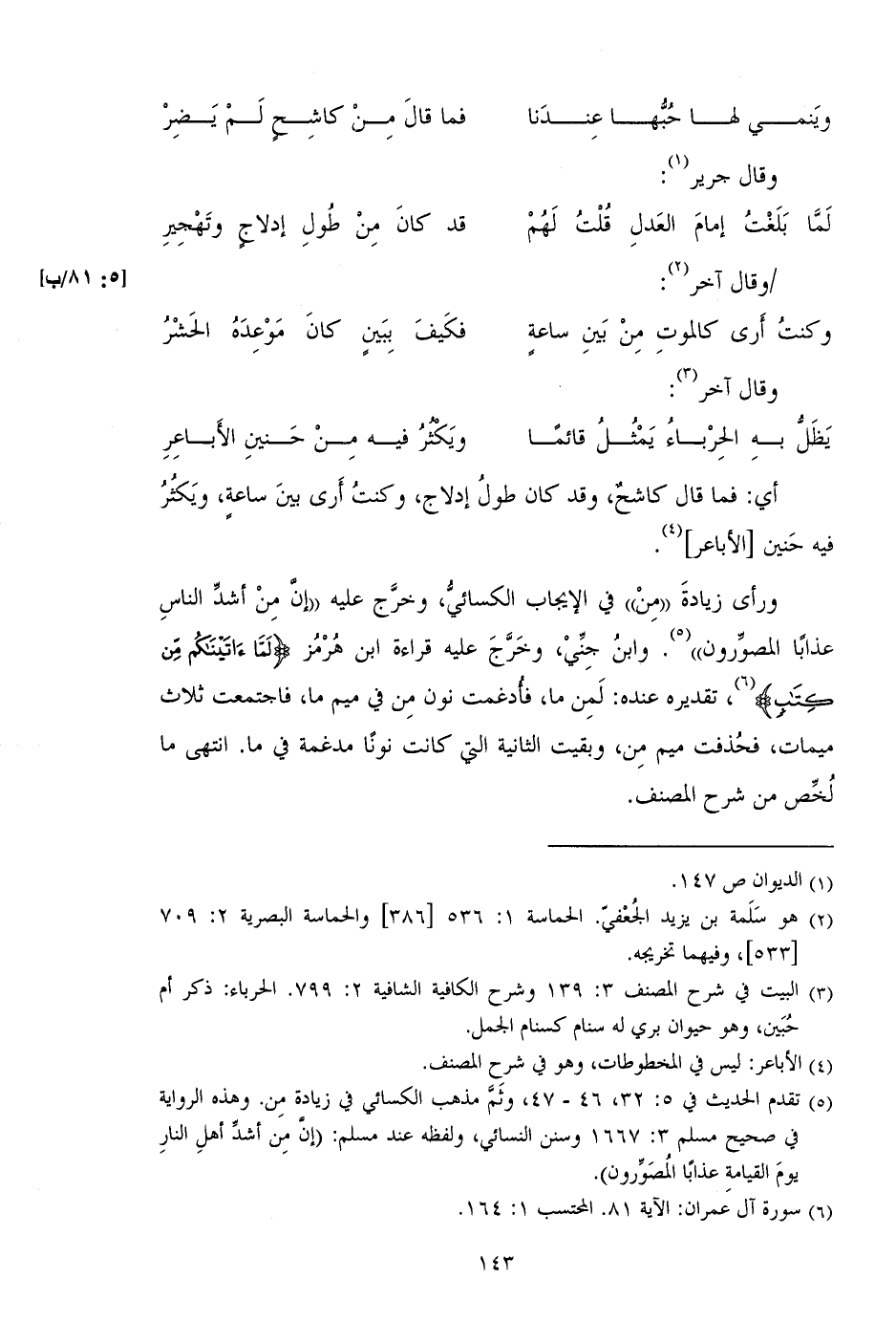 ورأى زيادة "من" في الإيجاب الكسائي، وخرج عليه "إن من أشد الناس عذاباً المصورون". وابن جني، وخرج عليه قراءة ابن هرمز (لَمَا آَتَيْتُكُمْ مِنْ كِتَابٍ)، تقديره عنده: لمن ما، فأدغمت نون من في ميم ما، فاجتمعت ثلاث ميمات، فحذفت ميم من، وبقيت الثانية التي كان نوناً مدغمة في ما. انتهى ما لخص من شرح المصنف.