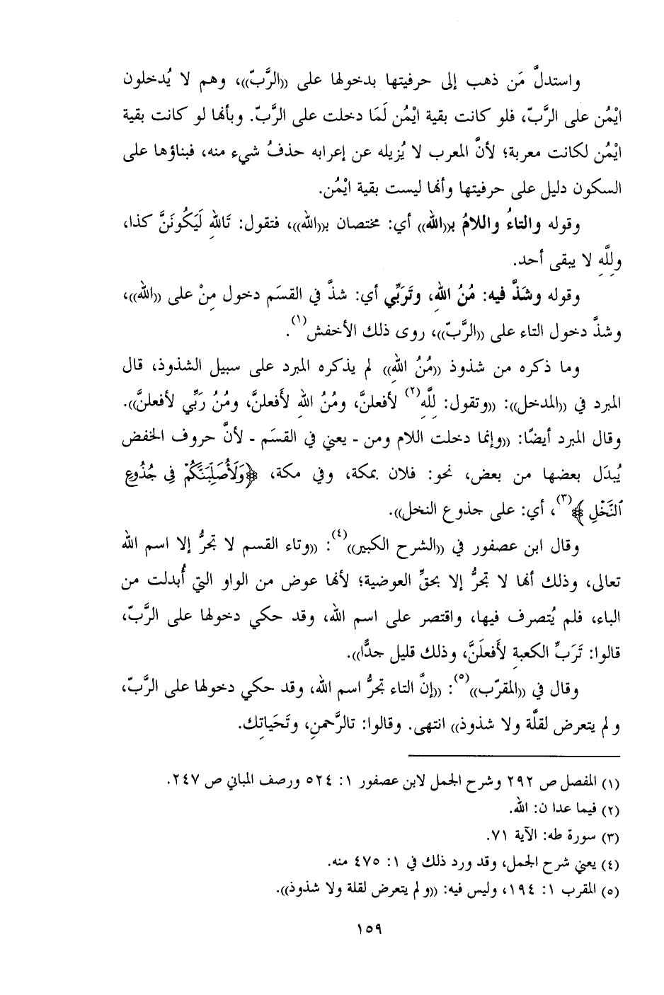 وقوله وشذ فيه: من الله، وتربى أي: شذ في القسم دخول من على "الله"، وشذ دخول التاء على "الرب"، روى ذلك الأخفش.