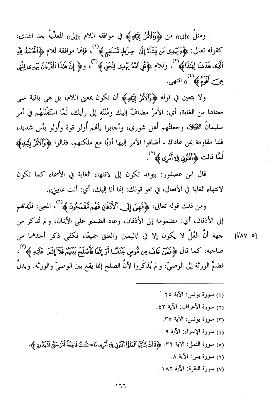 ومثل "إلى" من (وَالْأَمْرُ إِلَيْكِ) فيم وافقة اللام "إلى" المعدية بعد الهدى، كقوله تعالى: (يَهْدِي مَنْ يَشَاءُ إِلَى صِرَاطٍ مُسْتَقِيمٍ)، فإنها موافقة للام (الْحَمْدُ لِلَّهِ الَّذِي هَدَانَا لِهَذَا)، وللام (قُلِ اللَّهُ يَهْدِي لِلْحَقِّ)، و (إِنَّ هَذَا الْقُرْآَنَ يَهْدِي لِلَّتِي هِيَ أَقْوَمُ) " انتهى.