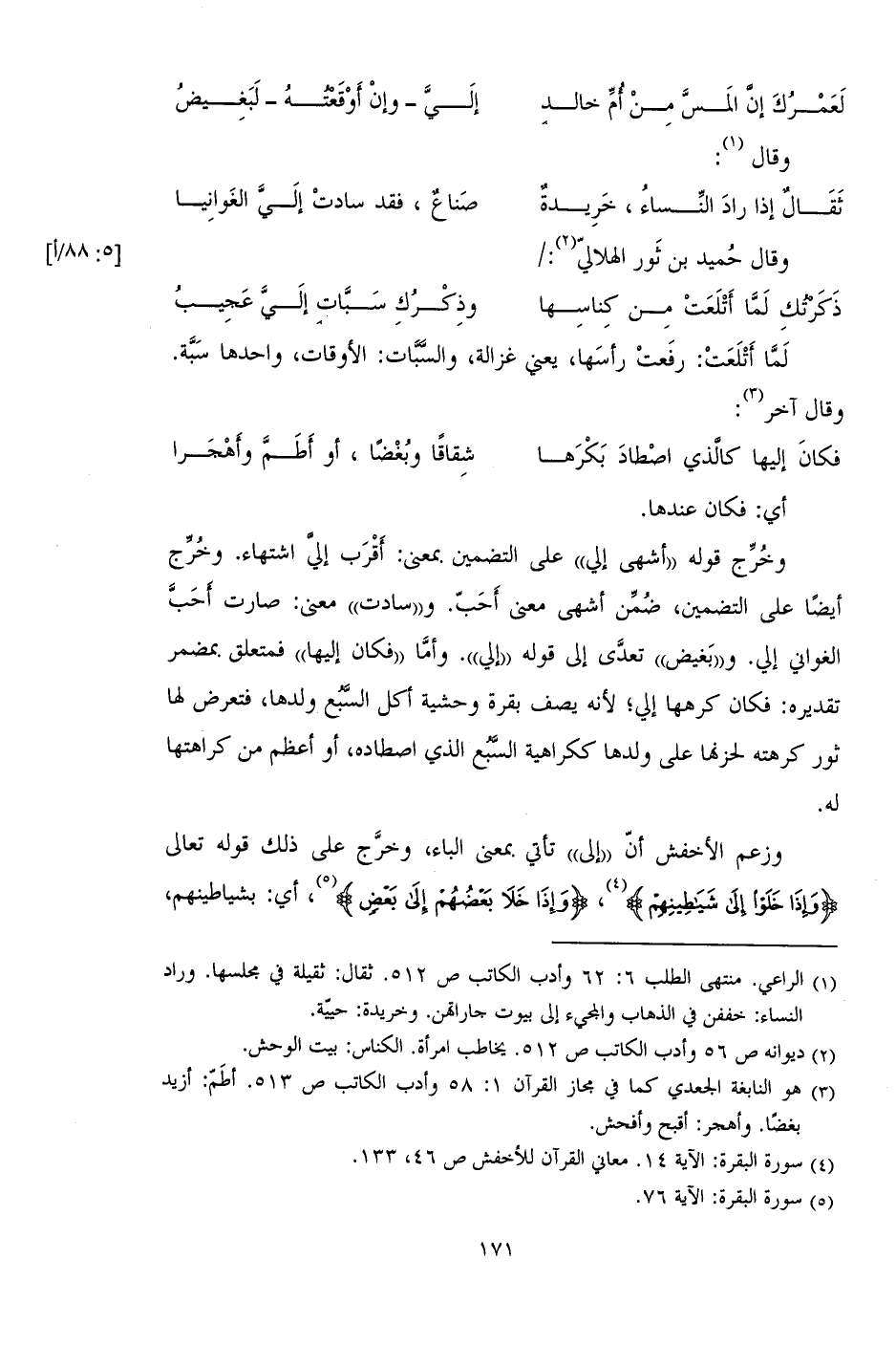 وخرج قوله "أشهى إلي" على التضمين بمعنى: أقرب إلى اشتهاء. وخرج أيضاً على التضمين، ضمن أشهى معنى أحب. و"سادت" معنى: صارت أحب الغواني إلي. و"بغيض" تعدى إلى قوله "إلي". وأما "فكان إليها" فمتعلق بمضمر تقديره: فكان كرهها إلي؛ لأنه يصف بقرة وحشية أكل السبع ولدها، فتعرض لها ثور كرهته لحزنها على ولدها ككراهية السبع الذي اصطاده، أو أعظم من كراهتها له.
