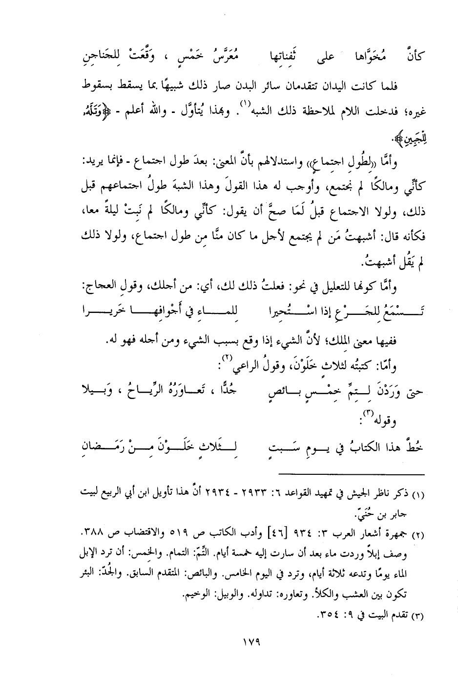 وأما "لطول اجتماع" واستدلالهم بأن المعنى: بعد طول اجتماع - فإنما يريد: كأني ومالكاً لم نجتمع، وأوجب له هذا القول وهذا الشبه طول اجتماعهم قبل ذلك، ولولا الاجتماع قبل لما صح أن يقول: كأني ومالكاً لم نبت ليلة معاً، فكأنه قال: أشبهت من لم يجتمع لأجل ما كان منا من طول اجتماع، ولولا ذلك لم يقل أشبهت.