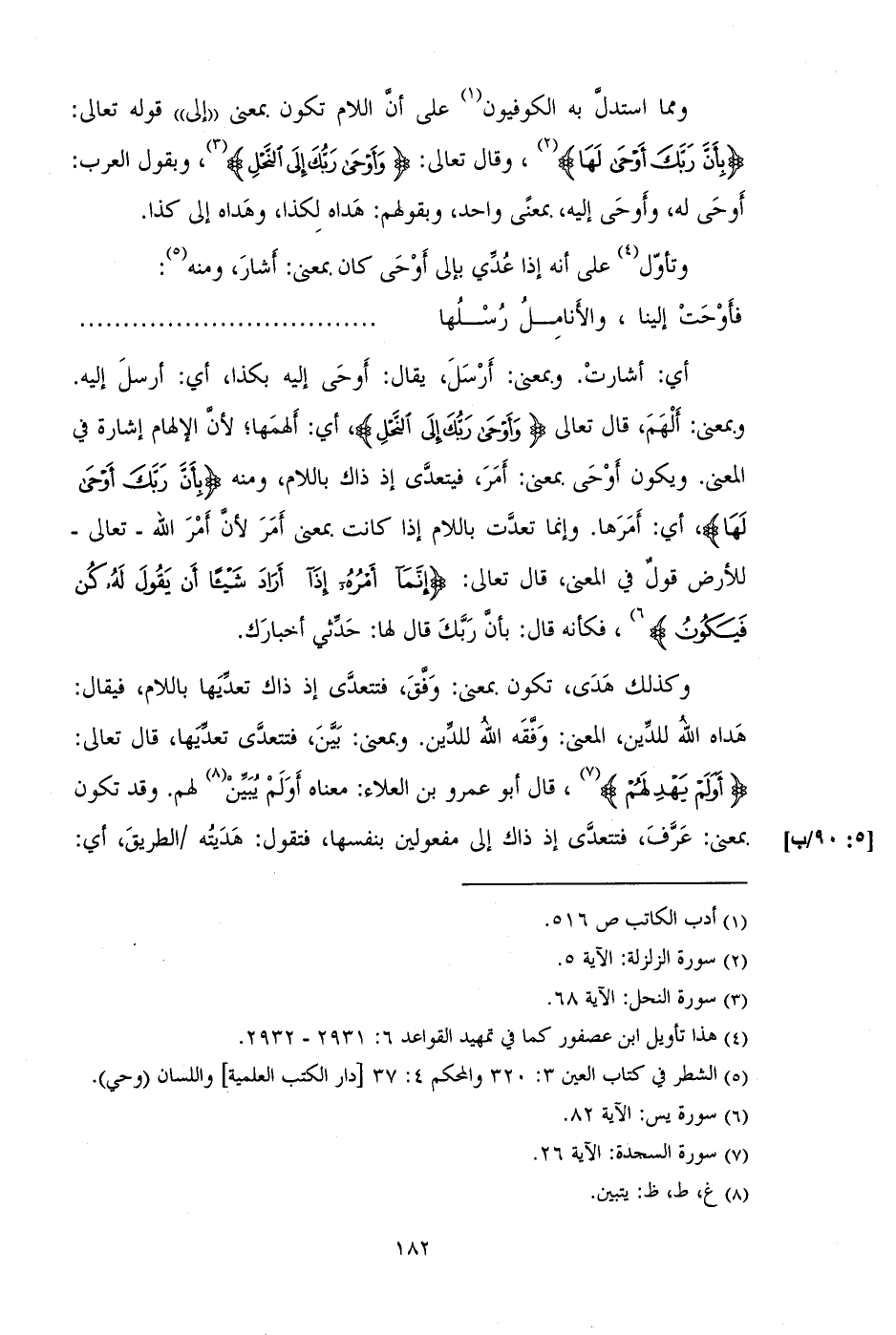 ومما استدل به الكوفيون على أن اللام تكون بمعنى "إلى" قوله تعالى: (بِأَنَّ رَبَّكَ أَوْحَى لَهَا)، وقال تعالى: (وَأَوْحَى رَبُّكَ إِلَى النَّحْلِ)، وبقول العرب: أوحى له، وأوحى إليه، بمعنى واحد، وبقولهم: هداه لكذا، وهداه إلى كذا.