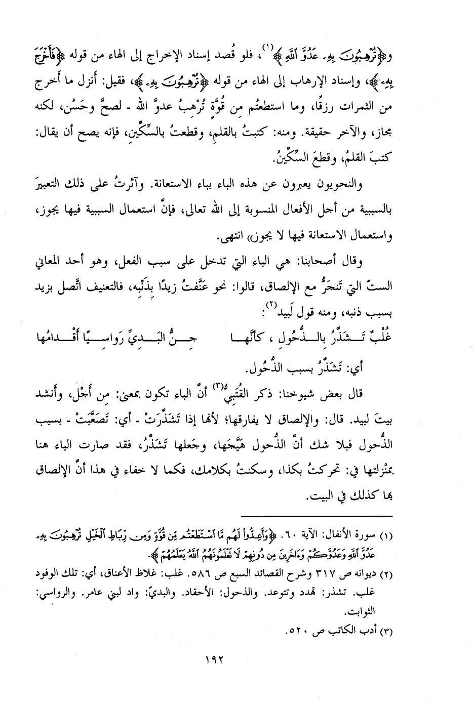 قال بعض شيوخنا: ذكر القتيبي أن الباء تكون بمعنى: من أجل، وأنشد بيت لبيد. قال: والإلصاق لا يفارقها؛ لأنها إذا تشذرت - أي: تصعبت - بسبب الذحول فبلا شك أن الذحول هيجها، وجعلها تشذر، فقد صارت الباء هنا بمنزلتها في: تحركت بكذا، وسكنت بكلامك، فكما لا خفاء في هذا أن الإلصاق بها كذلك في البيت.