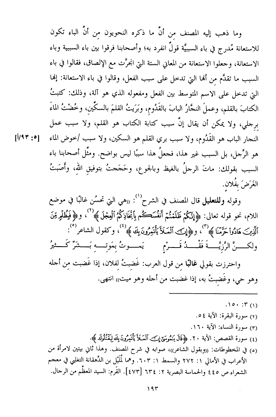 وما ذهب إليه المصنف من أن ما ذكره النحويون من أن الباء تكون للاستعانة مدرج في باء السببية قول انفرد به؛ وأصحابنا فرقوا بين باء السببية وباء الاستعانة، وجعلوا الاستعانة من المعاني الستة التي انجرت مع الإلصاق، فقالوا في باء السبب ما تقدم من أنها التي تدخل على سبب الفعل، وقالوا في باء الاستعانة: إنها التي تدخل على الاسم المتوسط بين الفعل ومفعوله الذي هو آلة، وذلك: كتبت الكتاب بالقلم، وعمل النجار الباب بالقدوم، وبريت القلم بالسكين، وخضت الماء برجلي، ولا يمكن أن يقال إن سبب كتابة الكتاب هو القلم، ولا سبب عمل النجار الباب هو القدوم، ولا سبب بري القلم هو السكين، ولا سبب /خوض الماء هو الرجل، بل السبب غير هذا، فجعل هذا سبباً ليس بواضح. ومثل أصحابنا باء السبب بقولك: مات الرجل بالغيظ وبالجوع، وحججت بتوفيق الله، وأصبت الغرض بفلان.
