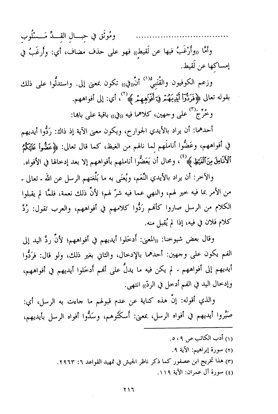 والآخر: أن يراد بالأيدي النعم، ويعني ب هنا بلغتهم الرسول عن الله- تعالى- من الأمر بما فيه خير لهم، والنهي عما فيه شر لهم؛ لأن ذلك نعمة، فلما لم يقبلوا الكلام من الرسل صاروا كأنهم ردوا كلامهم في أفواههم، والعرب تقول: رد كلام فلان، إذا لم يقبل منه.