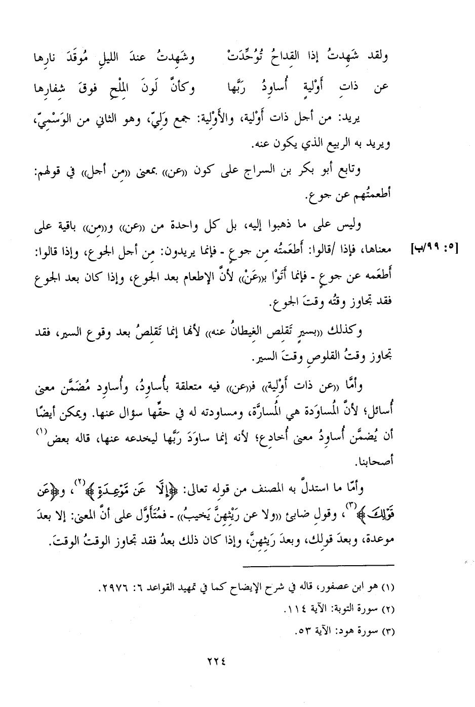 وأما ما استدل به المصنف من قوله تعالى: {إِلَّا عَنْ مَوْعِدَةٍ}، و {عَنْ قَوْلِكَ}، وقول ضابئ "ولا عن ريثهن يخيب"- فمتأول على أن المعنى: إلا بعد موعده، وبعد قولك، وبعد ريثهن، وإذا كان ذلك بعد فقد تجاوز الوقت الوقت.