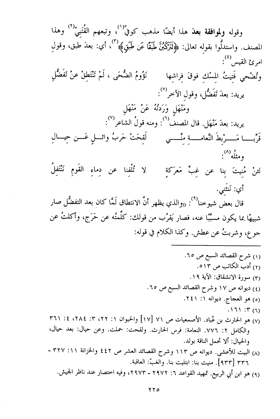 وقوله ولموافقة بعد هذا أيضا مذهب كوفي، وتبعهم القتبي وهذا المصنف. واستدلوا بقوله تعالى: {لَتَرْكَبُنَّ طَبَقًا عَنْ طَبَقٍ}، أيه: بعد طبق، وقول امرئ القيس:
