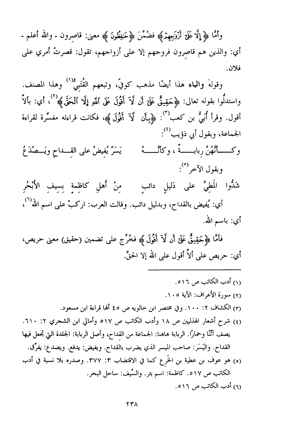 واستدلوا بقوله تعالى: {حَقِيقٌ عَلَى أَنْ لا أَقُولَ عَلَى اللَّهِ إِلَّا الْحَقَّ}، أي: بألا أقول. وقرأ أبي بن كعب: {أَنْ لا أَقُولَ}، فكانت قراءته مفسرة لقراءة الجماعة، وبقول أبي ذؤيب: