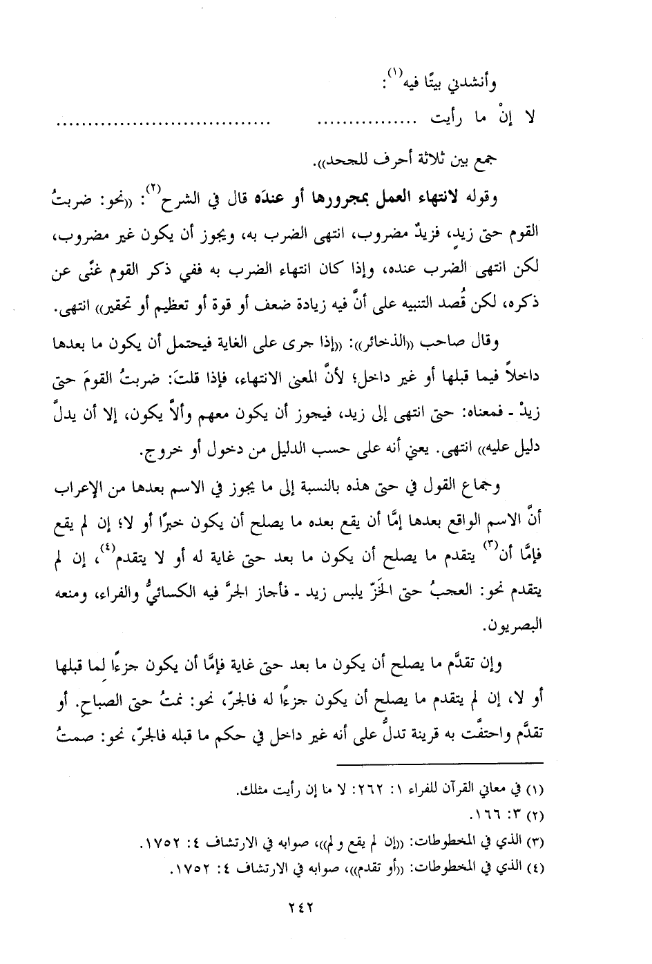 وجماع القول في حتى هذه بالنسبة إلى ما يجوز في الاسم بعدها من الإعراب أن الاسم الواقع بعدها إما أن يقع بعده ما يصلح أن يكون خبرًا أو لا؛ إن لم يقع فإما أن يتقدم ما يصلح أن يكون ما بعد حتى غاية له أو لا يتقدم، إن لم يتقدم نحو: العجب حتى الخز يلبس زيد-فأجاز الجر فيه الكسائي والفراء، ومنعه البصريون.