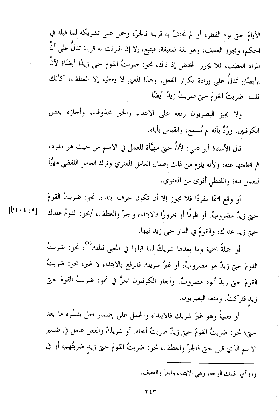 أو جملًة اسمية وما بعدها شريك لما قبلها في المعنى فتلك، نحو: ضربت القوم حتى زيد هو مضروب، أو غير شريك فالرفع بالابتداء لا غير، نحو: ضربت القوم حتى زيد أبوه مضروب. وأجاز الكوفيون الجر في نحو: ضربت القوم حتى زيد فتركت. ومنعه البصريون.