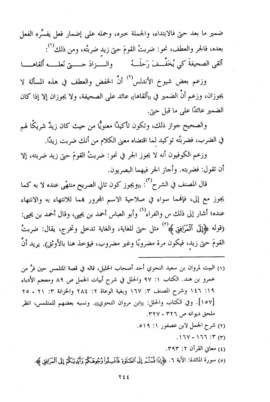 وزعم الكوفيون أنه لا يجوز الجر في نحو: ضربت القوم حتى زيد ضربته، إلا أن تقول: فضربته. وأجاز الجر فيهما البصريون.