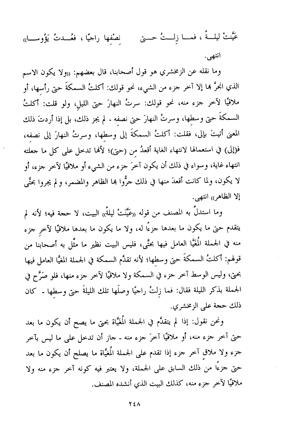 وما استدل به المصنف من قوله "عنيت ليلةً" البيت، لا حجة فيه؛ لأنه لم يتقدم حتى ما يكون ما بعدها جزءًا له، ولا ما يكون ما بعدها ملاقيًا لآخر جزء منه في الجملة المغيا العامل فيها بحتى، فليس البيت نظير ما مثل به أصحابنا من قولهم: أكلت السمكة حتى وسطها؛ لأنه تقدم السمكة في الجملة المغيا العامل فيها بحتى، وليس الوسط آخر جزء في السمكة ولا ملاقيًا لآخر جزء منها، فلو صرح في الجملة بذكر الليلة فقال: فما زلت راجيًا وصلها تلك الليلة حتى وسطها-كان ذلك حجة على الزمخشري.