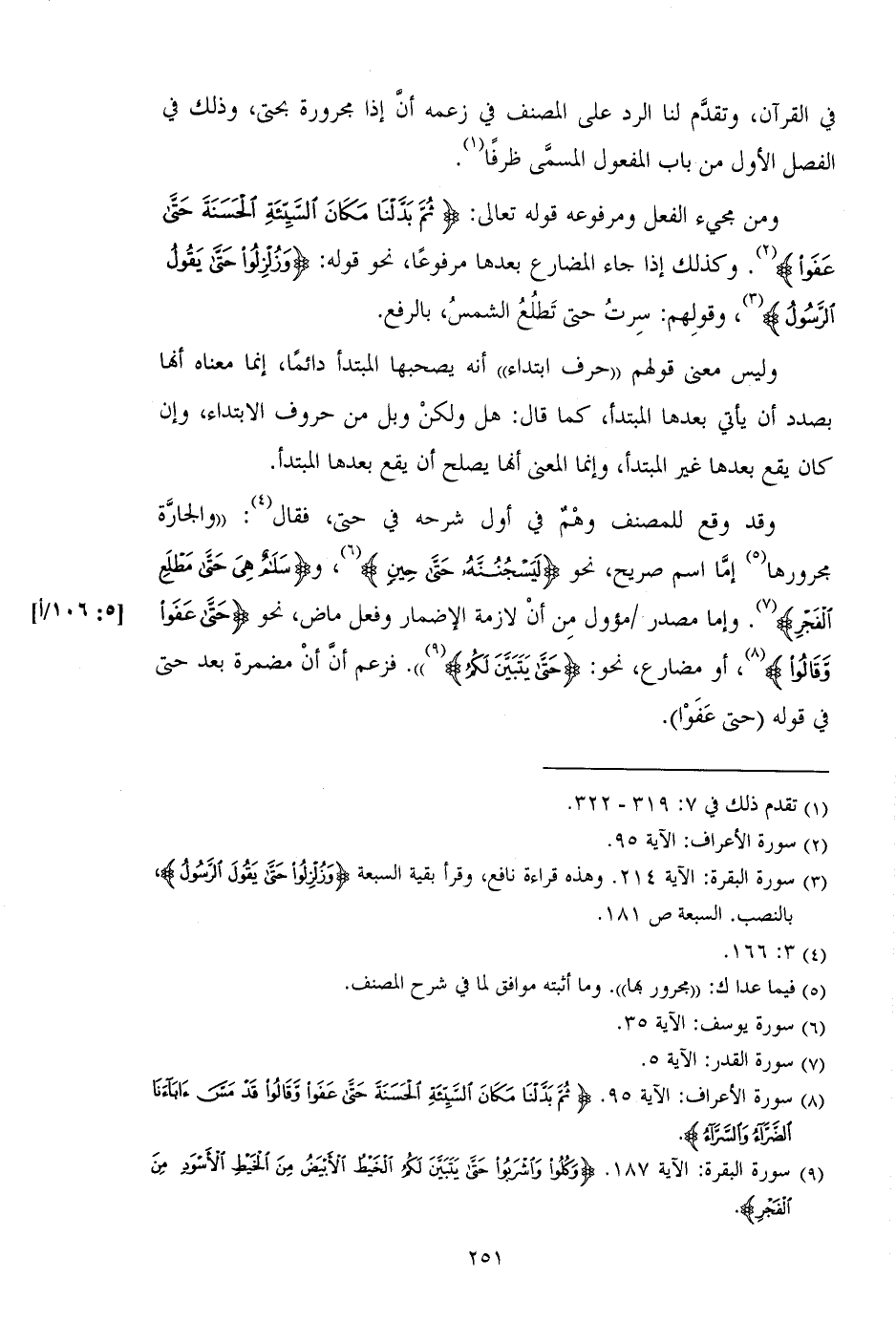 وقد وقع للمصنف وهم في أول شرحه في حتى، فقال: "والجارة مجرورها إما اسم صريح، نحو {لَيَسْجُنُنَّهُ حَتَّى حِين}، و {سَلامٌ هِيَ حَتَّى مَطْلَعِ الْفَجْرِ}، أو مضارع، نحو: {حَتَّى يَتَبَيَّنَ لَكُمُ} ". فزعم أن مضمرة بعد حتى في قوله (حتى عفوا).