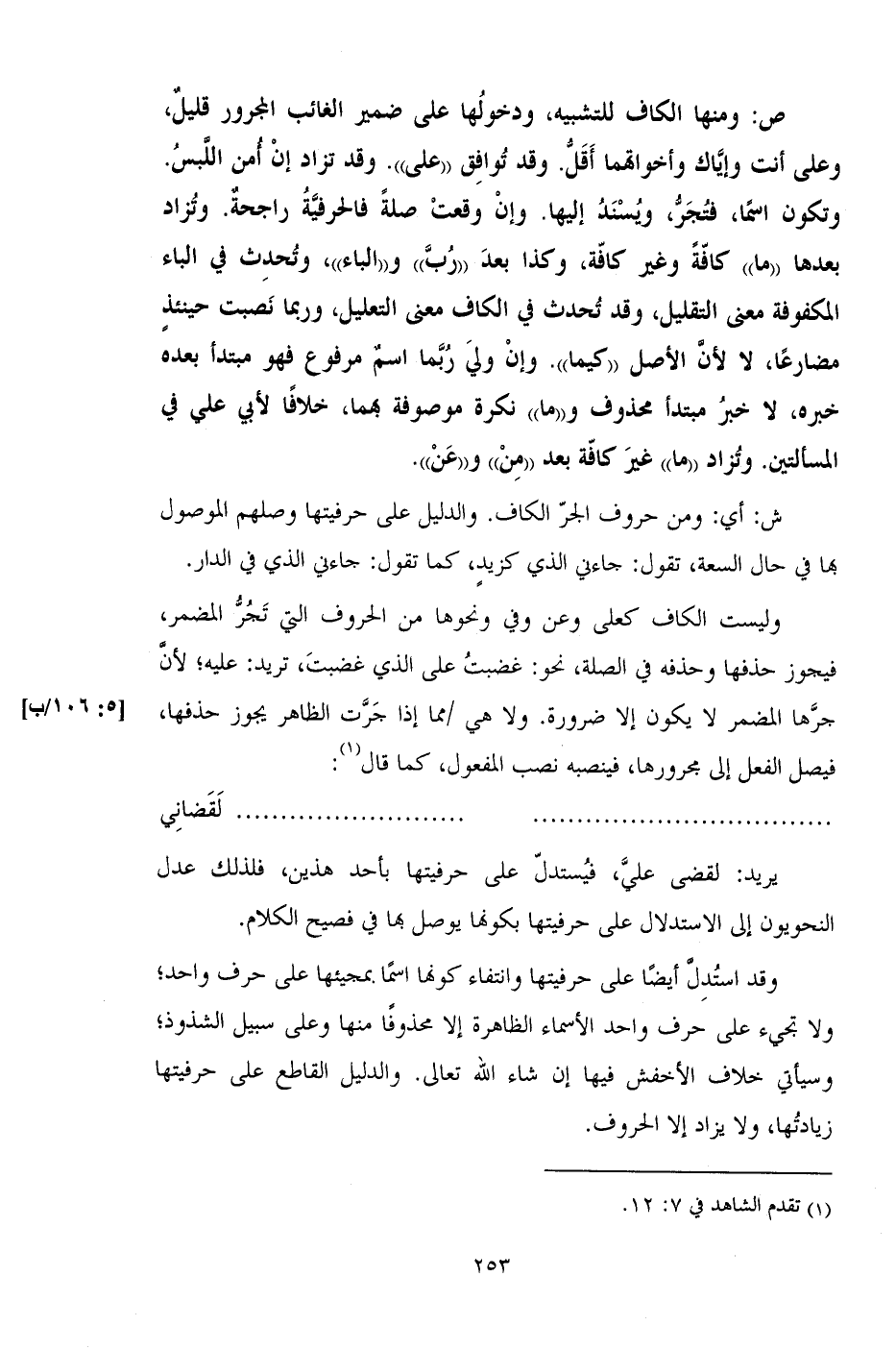 ش: أي: ومن حروف الجر الكاف. والدليل على حرفيتها وصلهم الموصول بها في حال السعة، تقول: جاءني الذي كزيد، كما تقول: جاءني الذي في الدار.