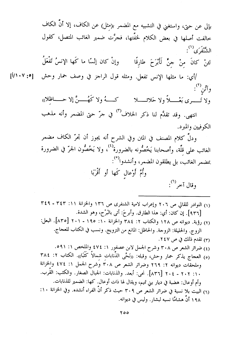 ودل كلام المصنف في المتن وفي الشرح أنه يجوز أن تجر الكاف مضمر الغائب على قلة، وأصحابنا يخصونه بالضرورة، ولا يخصون الجر في الضرورة بمضمر الغائب، بل يطلقون المضمر، وأنشدوا: