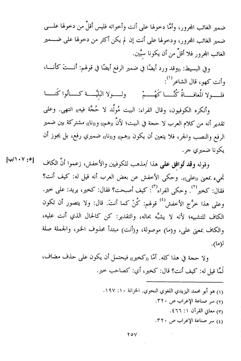 ولا حجة في هذا كله. أما "كخير" فيحتمل أن يكون على حذف مضاف، لما قيل له: كيف أنت؟ قال: كخير، أي: كصاحب خير.