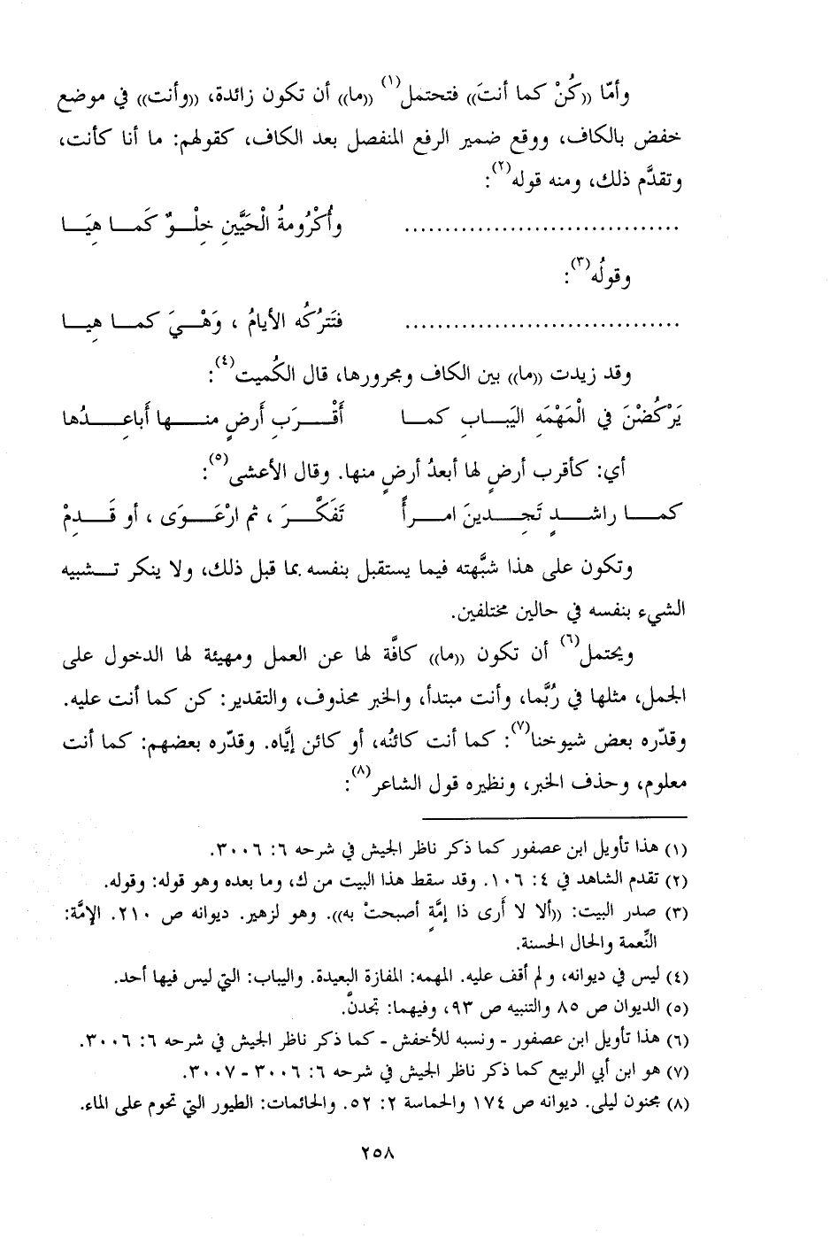ويحتمل أن تكون"ما"كافة لها عن العمل ومهيأة لها الدخول على الجمل، مثلها في ربما، وأنت مبتدأ، والخبر محذوف، والتقدير: كن كما أنت عليه. وقدره بعض شيوخنا: كما أنت كائنه، أو كائن إياه. وقدره بعضهم: كما أنت معلوم، وحذف الخبر، ونظيره قول الشاعر: