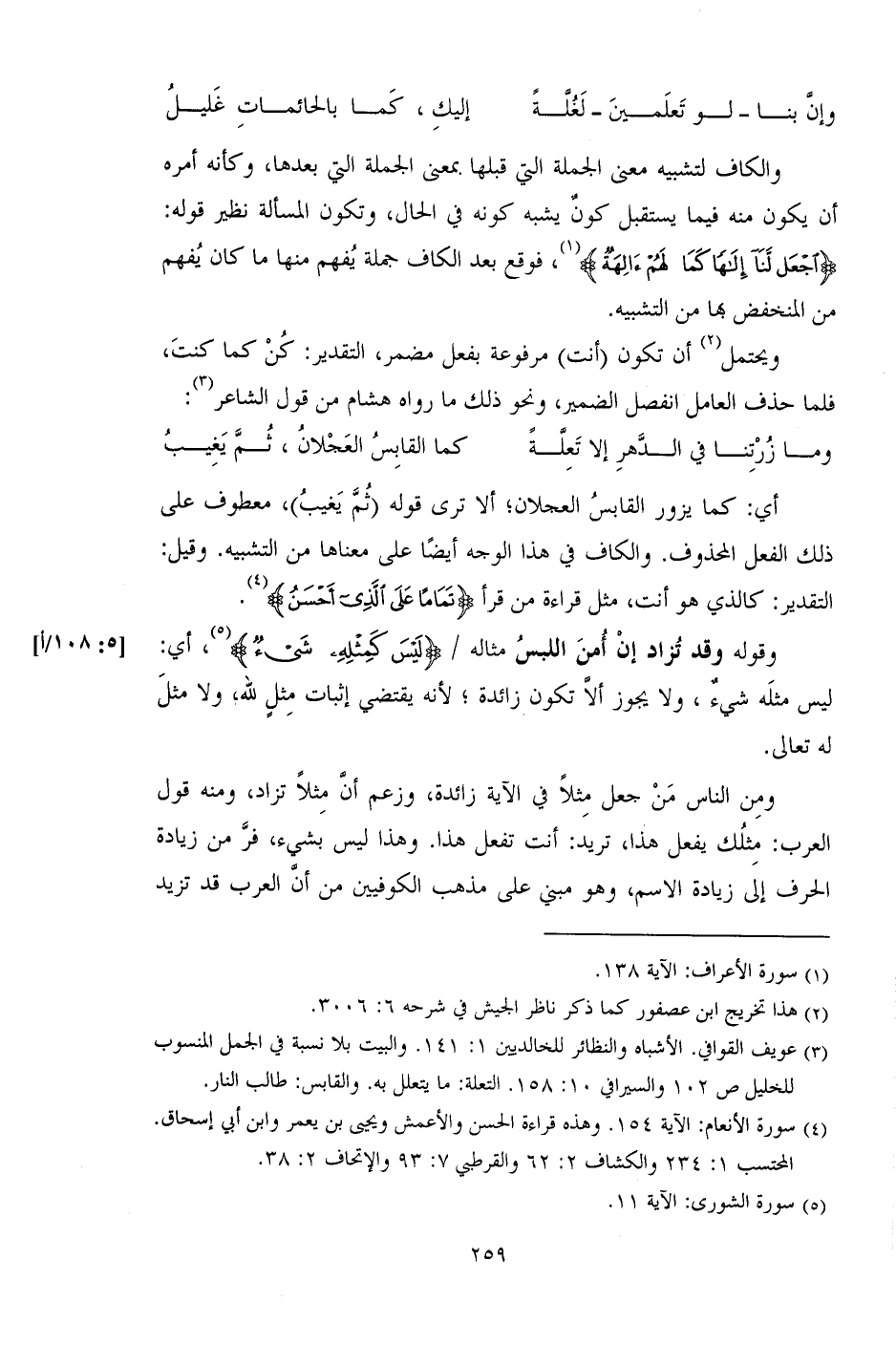 وقوله وقد تزاد إن أمن اللبس مثاله/ {لَيْسَ كَمِثْلِهِ شَيْءٌ}، أي: ليس مثله شيء، ولا يجوز ألا تكون زائدة؛ لأنه يقتضي إثبات مثل الله، ولا مثل له تعالى.