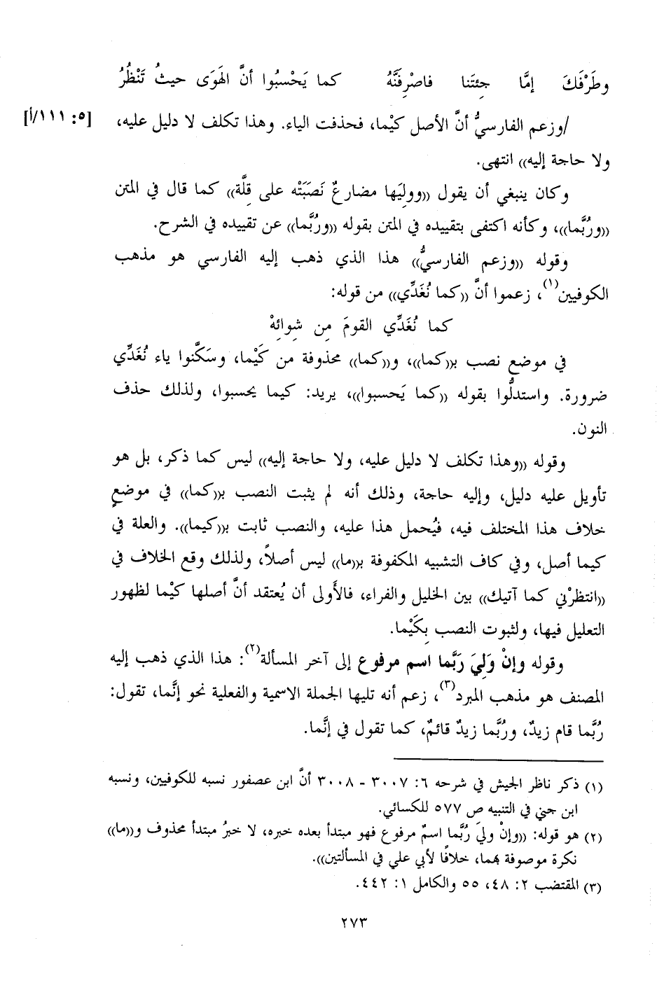 وقوله "وهذا تكلف لا دليل عليه، ولا حاجة إليه" ليس كما ذكر، بل هو تأويل عليه دليل، وإليه حاجة، وذلك أنه لم يثبت النصب بـ"كما" في موضع خلاف هذا المختلف فيه، فيحمل هذا عليه، والنصب ثابت بـ"كيما". والعلة في كيما أصل، وفي كاف التشبيه المكفوفة بـ"انتظرني كما آتيك" بين الخليل والفراء، فالأولى أن يعتقد أن أصلها كيما لظهور التعليل فيها، ولثبوت النصب بكيما.