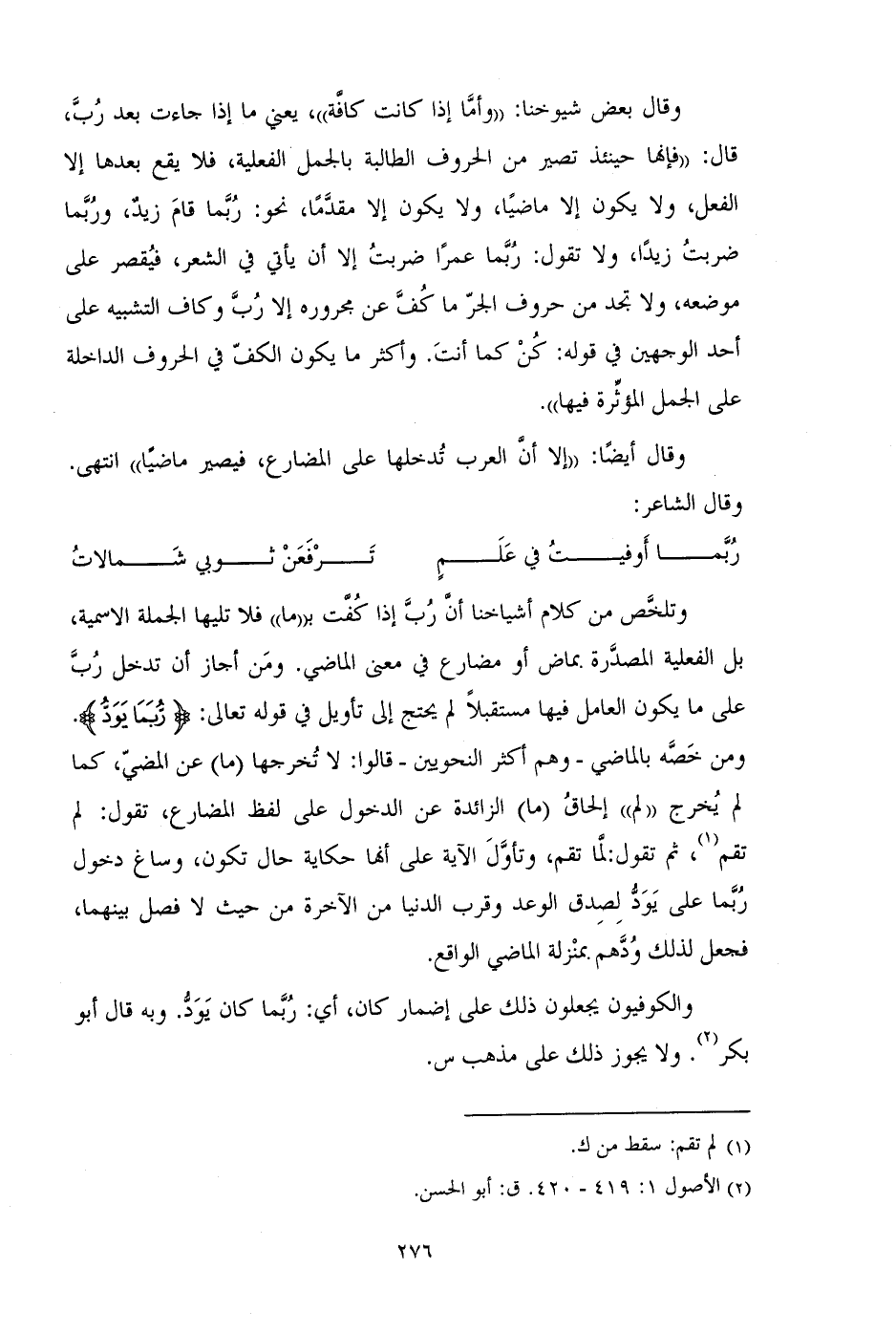 وتلخص من كلام أشياخنا أن رب إذا كفت بـ"ما" فلا تليها الجملة الاسمية، بل الفعلية المصدرة بماض أو مضارع في معنى الماضي. ومن أجاز أن تدخل رب على ما يكون العامل فيها مستقبلا لم يحتج إلى تأويل في قوله تعالى: {رُبَمَا يَوَدّ}