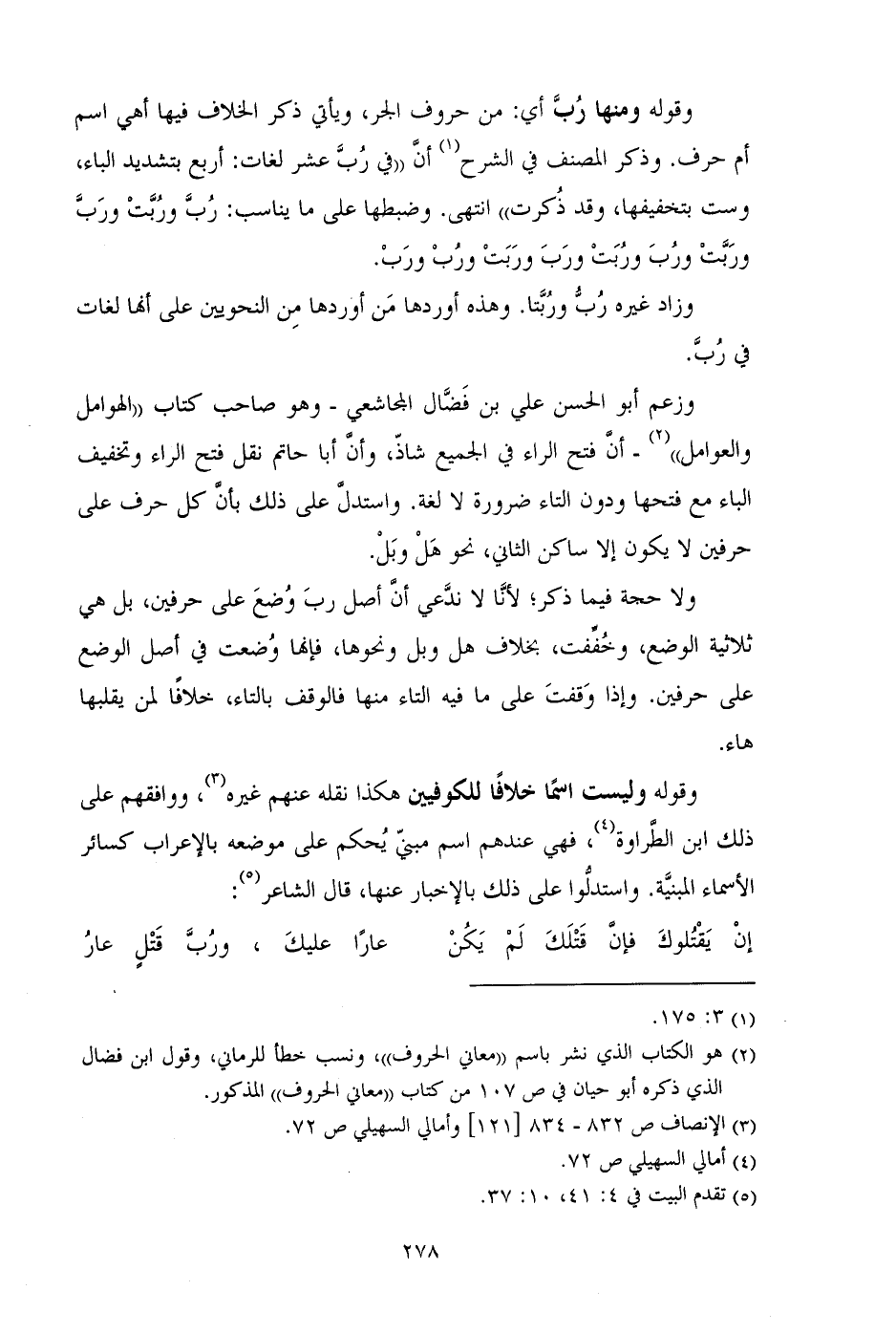 ولا حجة فيما ذكر؛ لأنا لا ندعي أن أصل رب وضع على حرفين، بل هي ثلاثية الوضع، وخففت، بخلاف هل وبل ونحوها، فإنها وضعت في أصل الوضع على حرفين. وإذا وقفت على ما فيه التاء منها فالوقوف بالتاء، خلافا لمن يقلبها هاء.