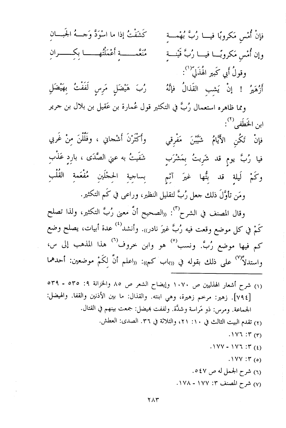 وقال المصنف في الشرح: "الصحيح أن معنى رب التكثير، ولذا تصلح كم في كل موضع وقعت فيه رب غير نادر". وأنشد عدة أبيات، يصلح وضع كم فيها موضع رب. ونسب هو وابن خروف هذا المذهب إلى س، واستدلا على ذلك بقوله في "باب كم ": "أعلم أن لكم موضعين: أحدهما
