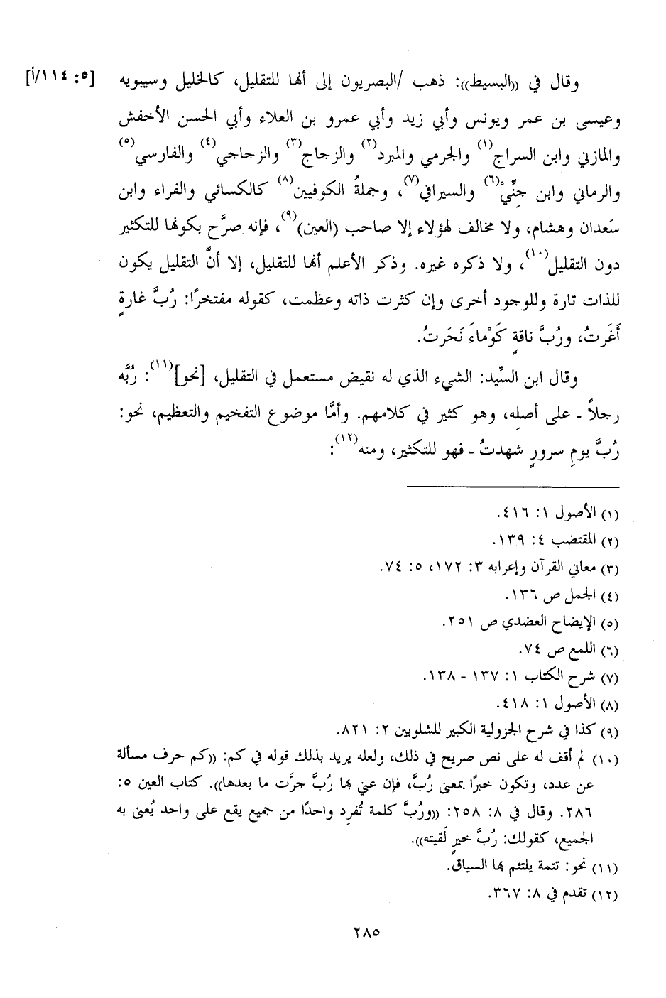 وقال في "البسيط": ذهب/ البصريون إلى أنها للتقليل، كالخليل وسيبويه وعيسى بن عمر ويونس وأبي زيد وأبي عمرو بن العلاء وأبي الحسن الأخفش والمازني وابن السراج والجرمي والمبرد والزجاج والزجاجي والفارسي والرماني وابن جني والسيرافي، وجملة الكوفيين كالكسائي والفراء وابن سعدان وهشام، ولا مخالف لهؤلاء إلا صاحب العين، فإنه صرح بكونها للتكثير دون التقليل، ولا ذكره لغيره. وذكر الأعلم أنها للتقليل، إلا أن التقليل يكون للذات تارة وللوجود أخرى وإن كثرت ذاته وعظمت، كقوله مفتخرا: رب غارة أغرت، ورب ناقة كوماء نحرت.