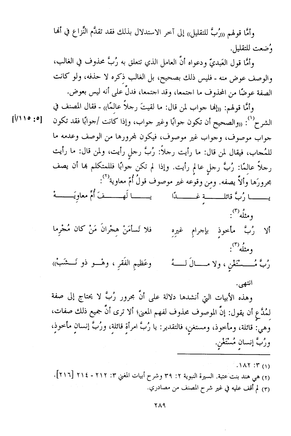 وأما قولهم: "إنها جواب لمن قال: ما لقيت رجلا عالما"- قال المصنف في الشرح: "والصحيح أن تكون جوابا وغير جواب، وإذا كانت/ جوابا فقد تكون جواب موصوف، وجواب غير موصوف، فيكون لمجرورها من الوصف وعدمه ما للمجاب، فيقال لمن قال: ما رأيت رجلا: رب رجل رأيت، ولمن قال: ما رأيت رجلا عاما: رب رجل عالم رأيت. وإذا لم تكن جوابا فللمتكلم بها أن يصف مجرورها وألا يصفه. ومن وقوعه غير موصوف قول أم معاوية: